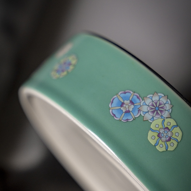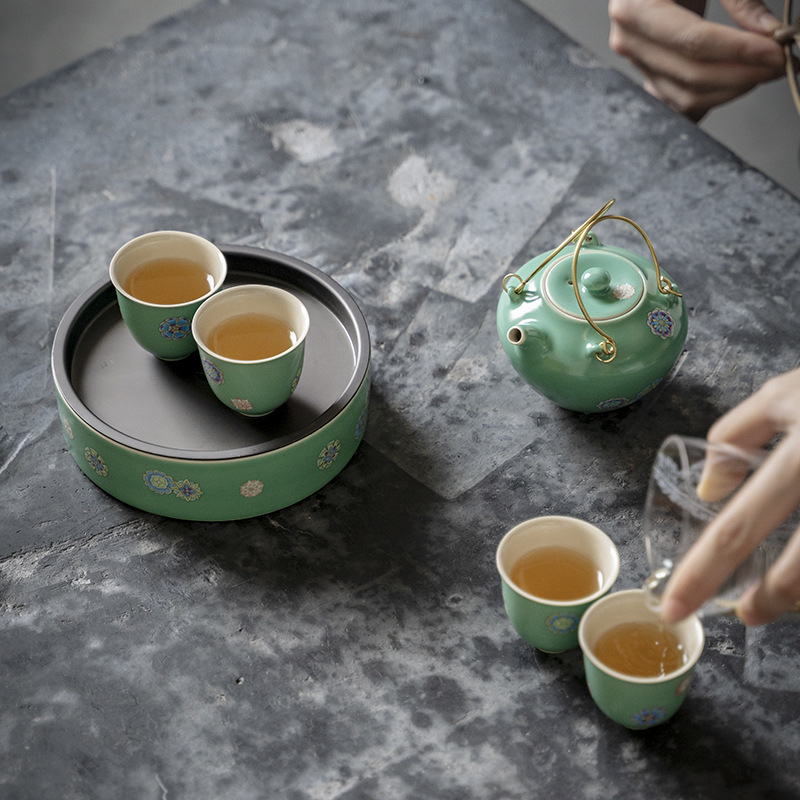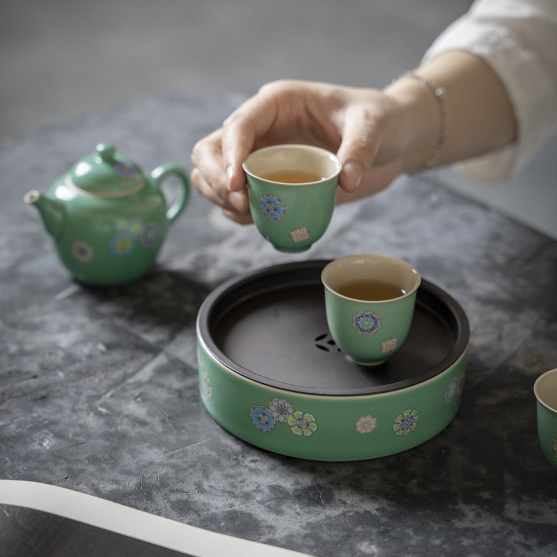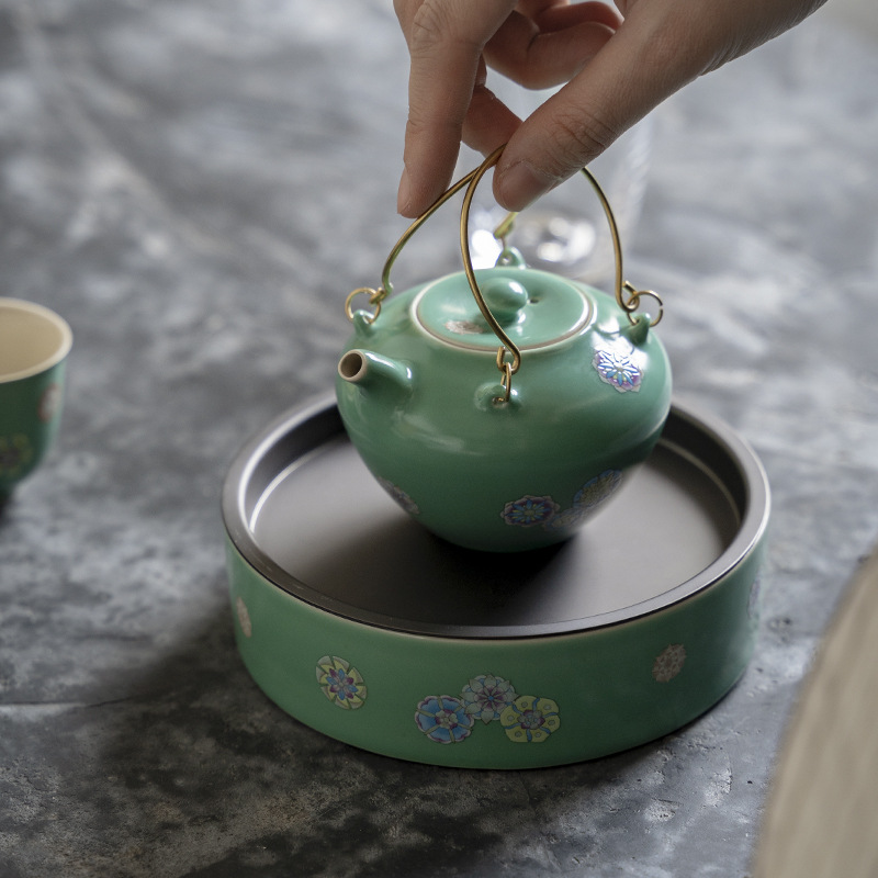 Turquoise Green Glazed Leather Ball Flower Tin Lid Kettle Holding Water Tea Tray Building Water Round Handmade Water Storage Dry Bubble Tray Tea Ceremony Accessories