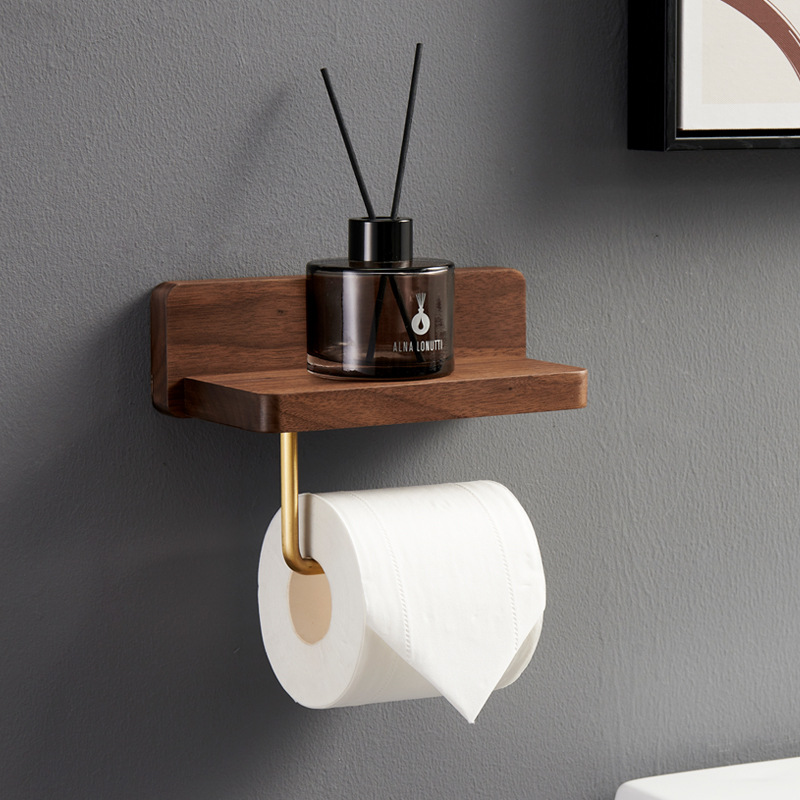 Paper Towel Holder Solid Wood Bathroom Brass Toilet Roll Paper Holder Wall Hanging Punch-free Black Walnut Mobile Phone Holder Storage Rack