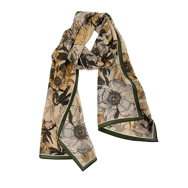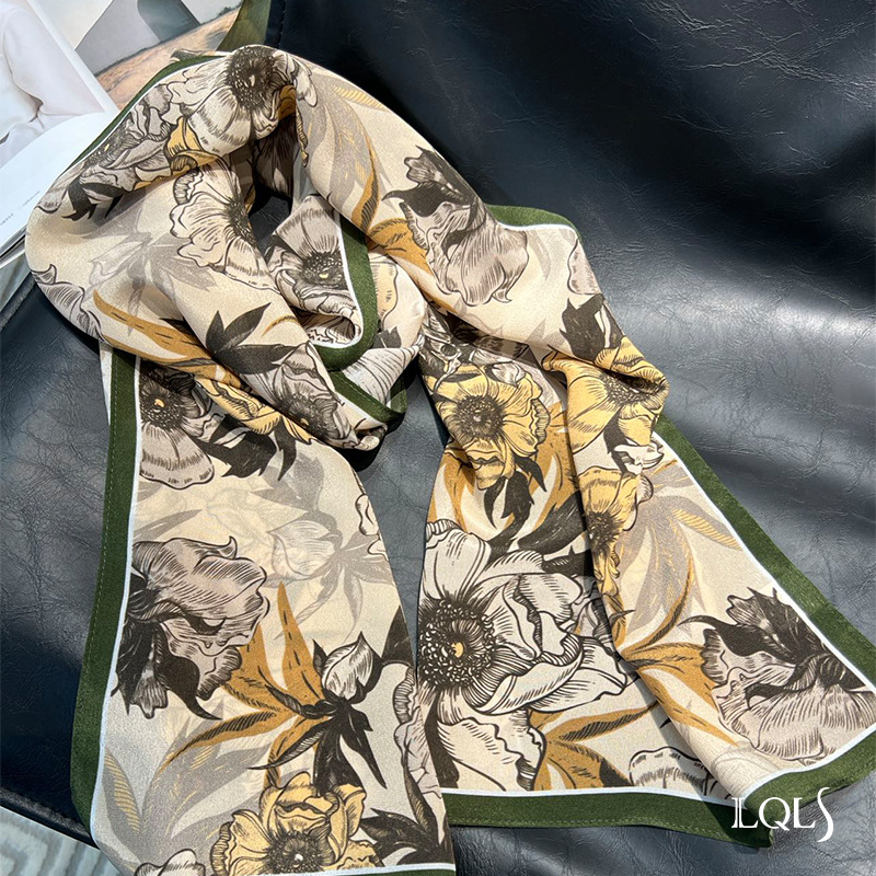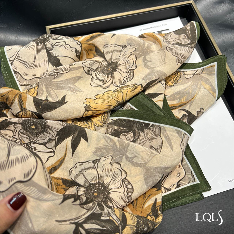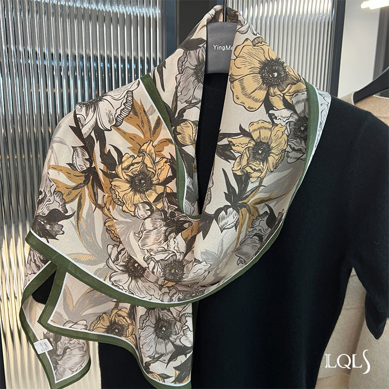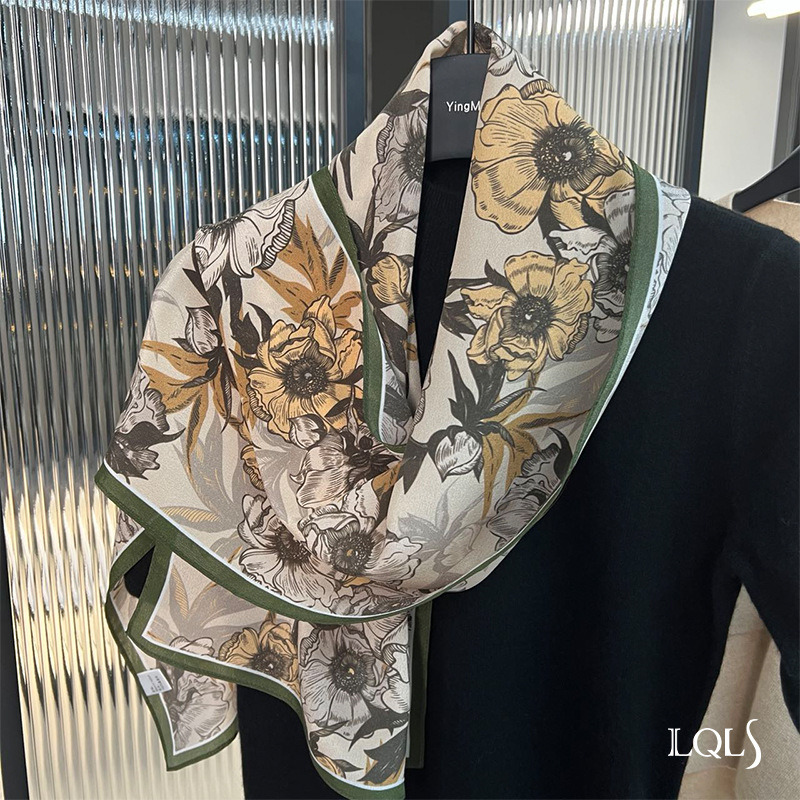 Temperament Style!Early Autumn Light Coffee Style Botanical Print Silk Shawl Scarf Two-Purpose Women's Autumn And Winter Versatile Silk Scarf
