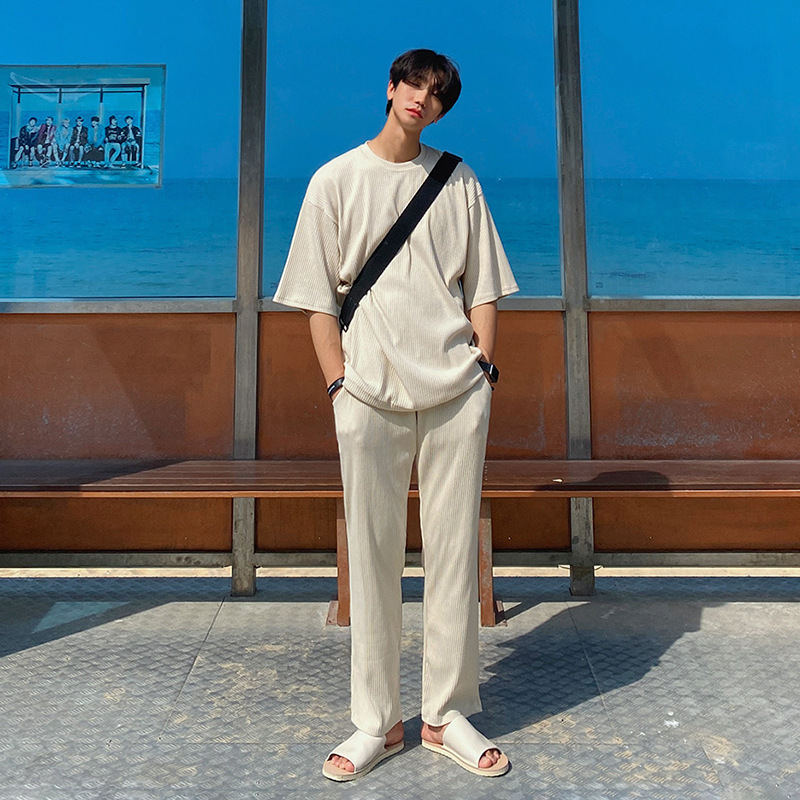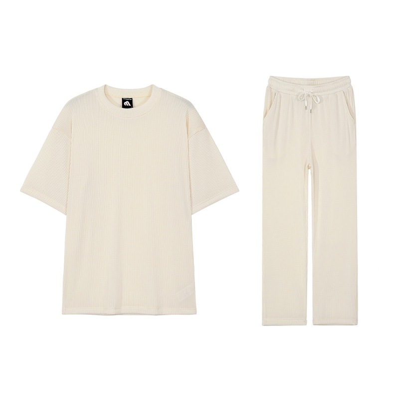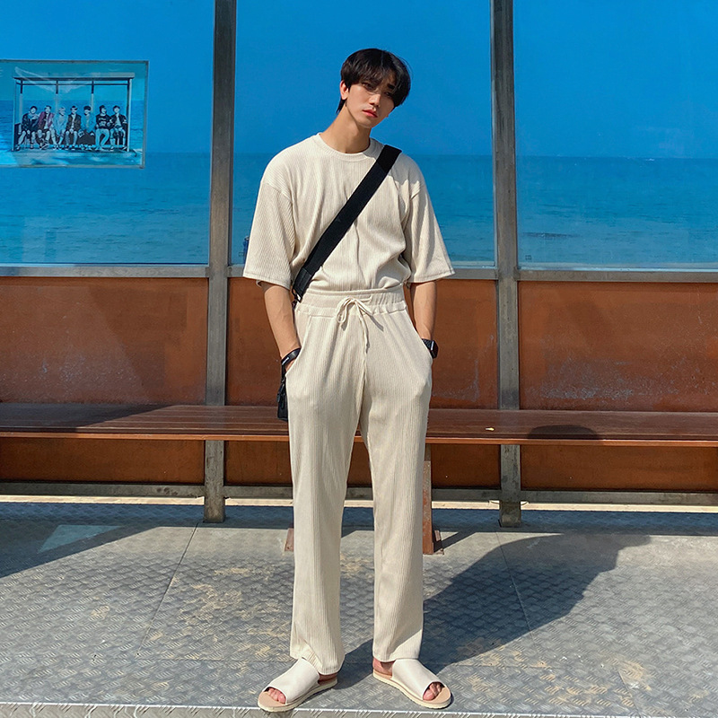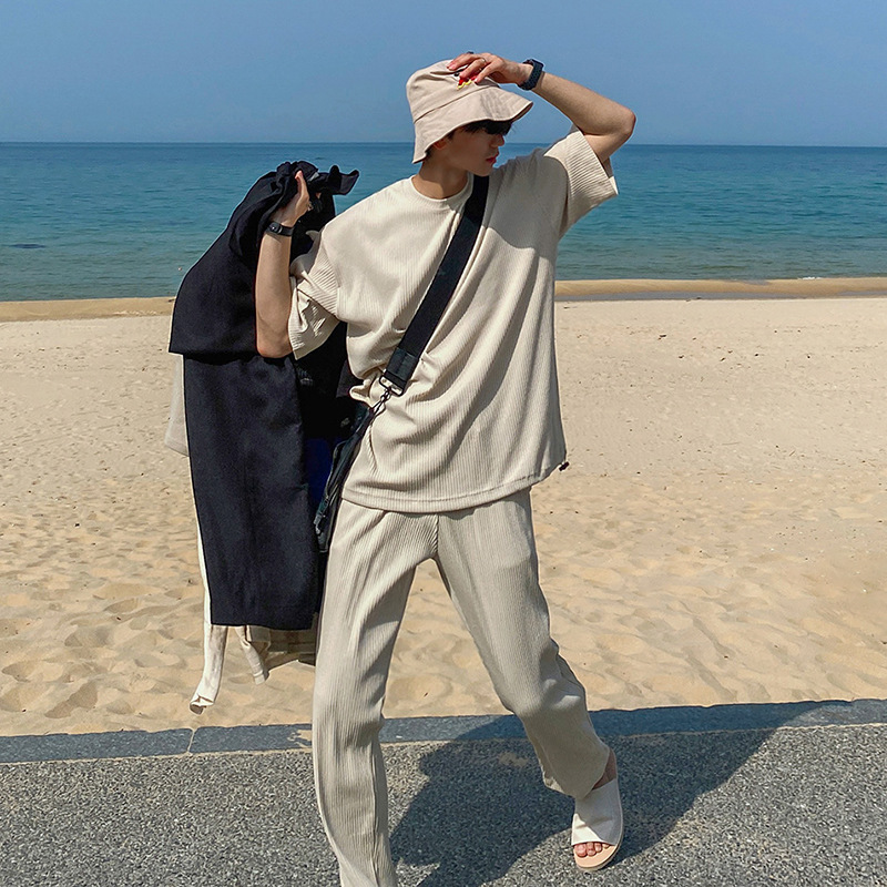MYQMen's Summer Suit Short-sleeved T-shirt Versatile Summer Solid Color Half-sleeved Ice Silk Loose T-shirt Set Of Clothes