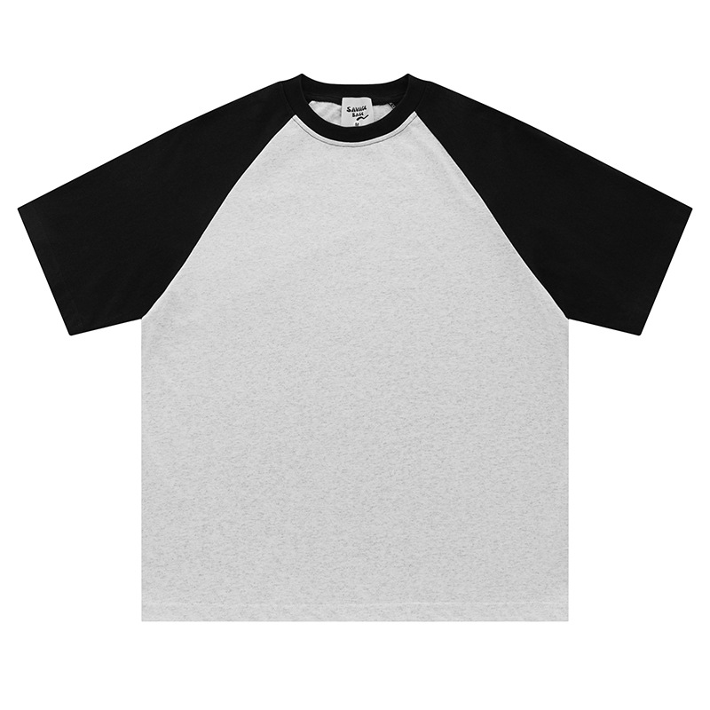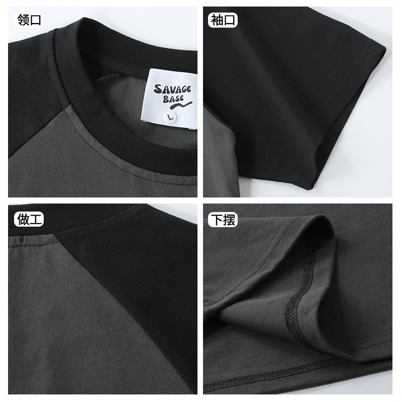 300g26 Count Double Yarn Cotton Heavyweight Raglan Sleeves Contrasting Color Round Neck Short-sleeved Summer American Retro Splicing Short-sleeved T-shirt