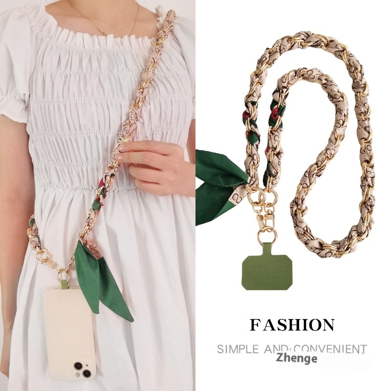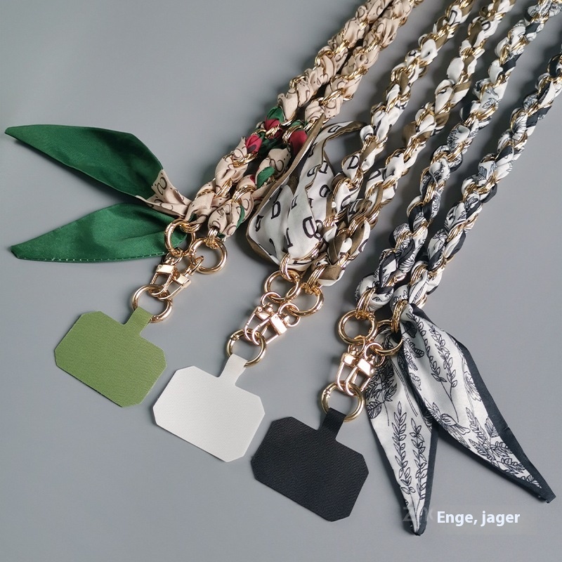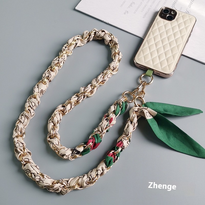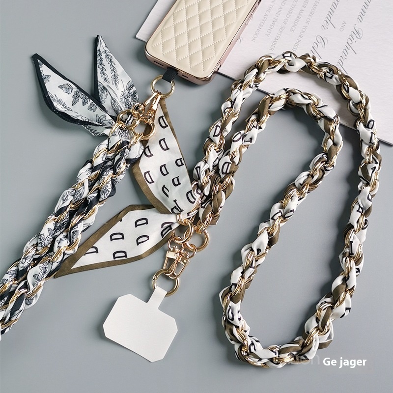 Diagonal Style Twisted Chain Silk Scarf Mobile Phone Lanyard Long Shoulder Strap Sling Bag Metal Chain