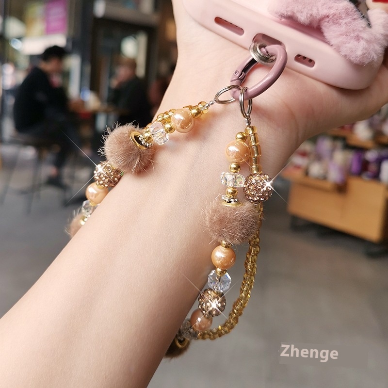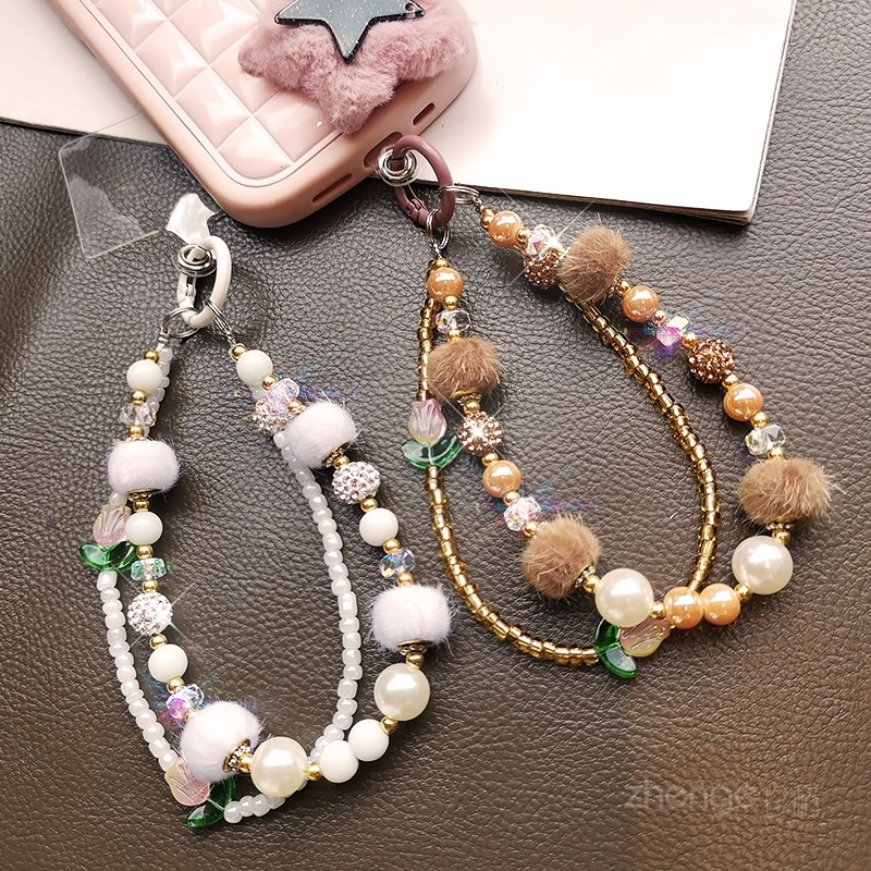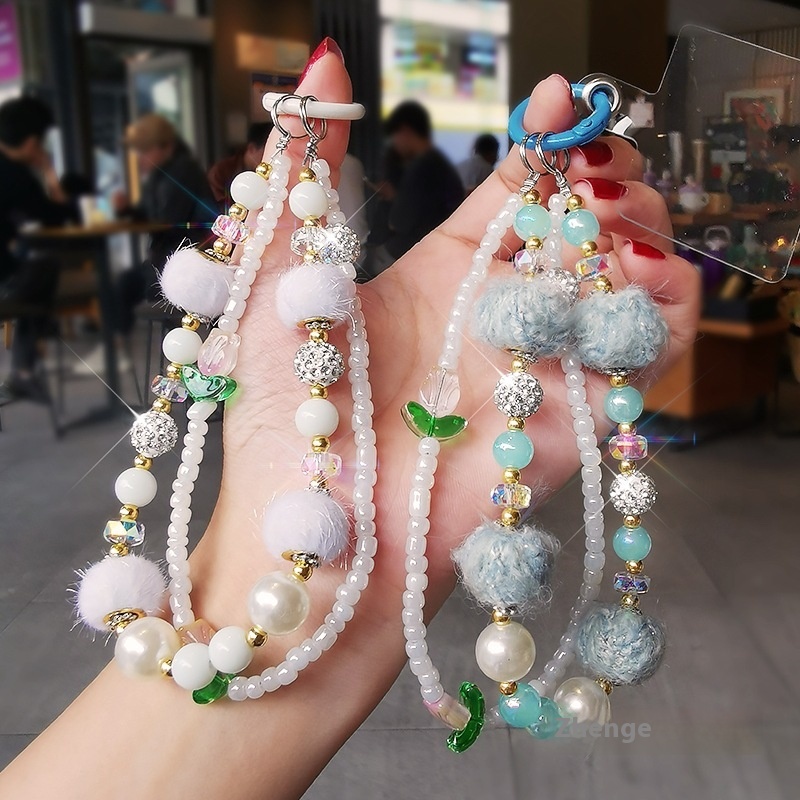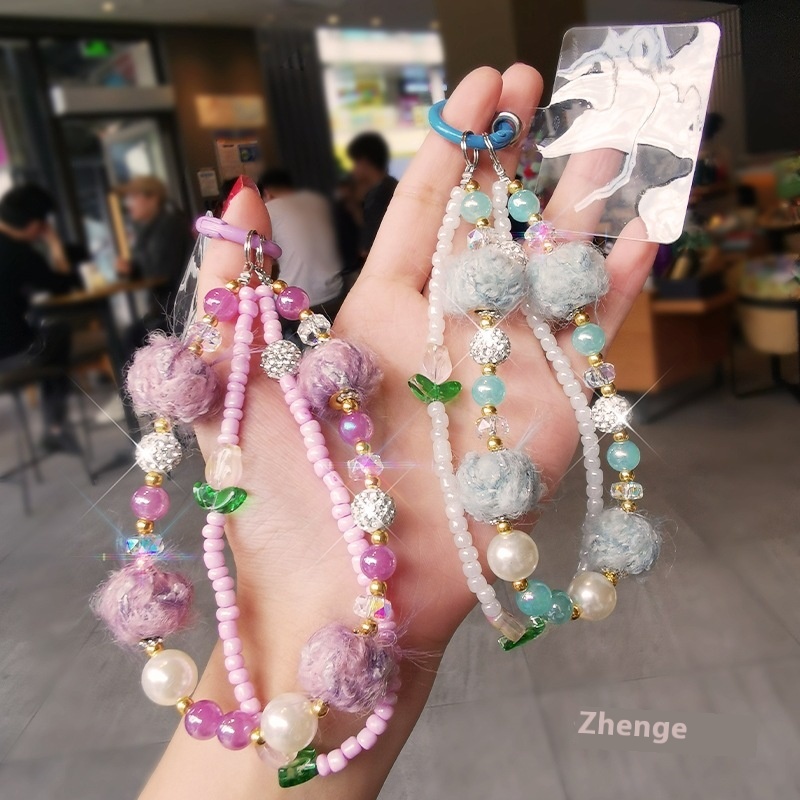 Hair Ball Double Chain Mobile Phone Lanyard Short Wrist Strong Wire Rope Handmade Bead Chain