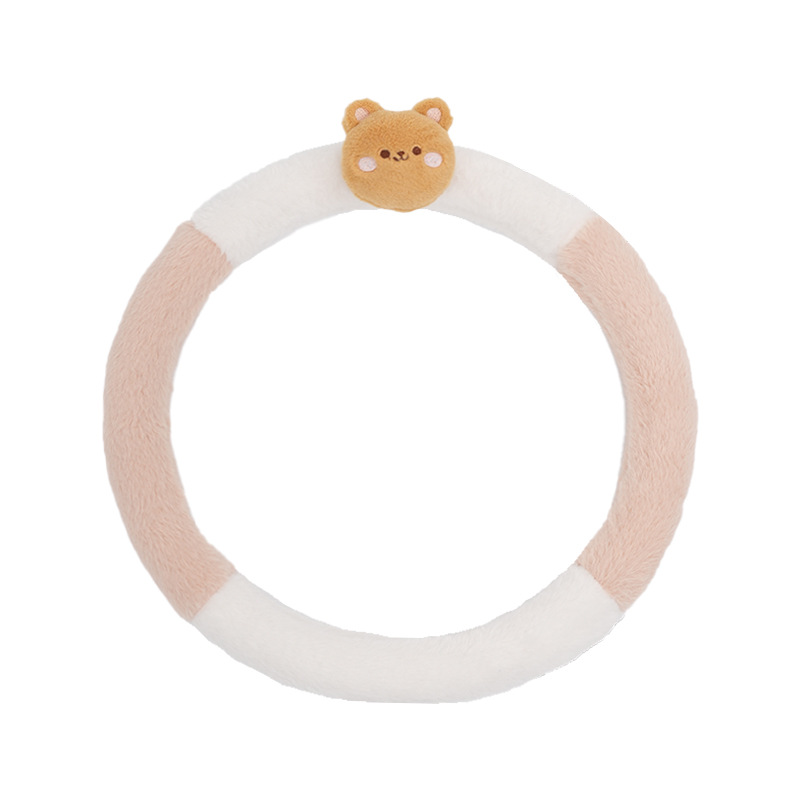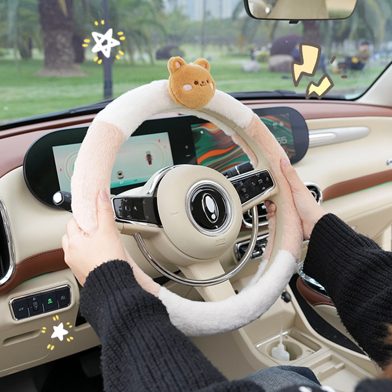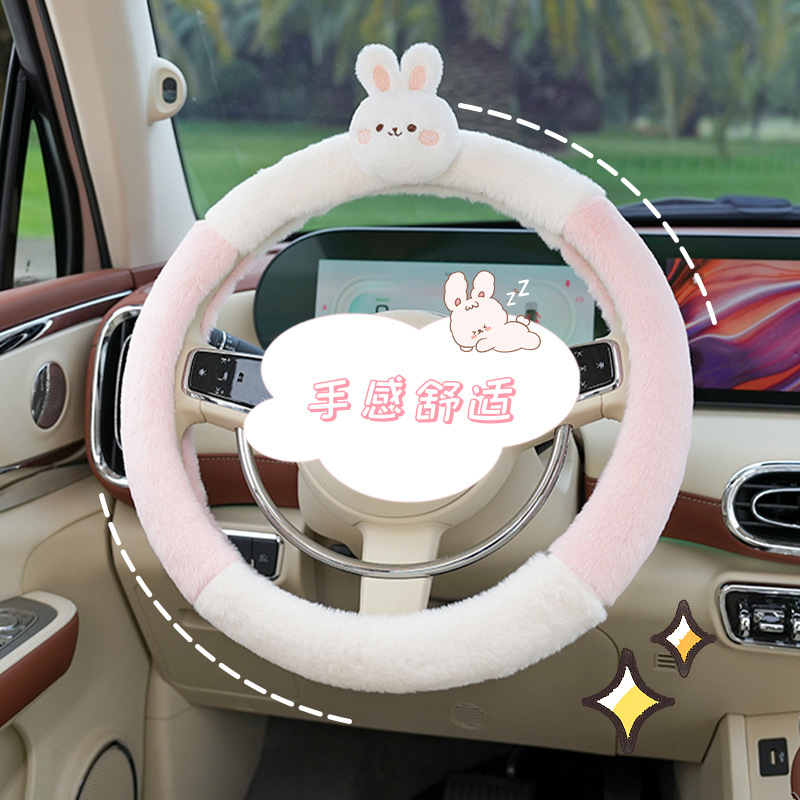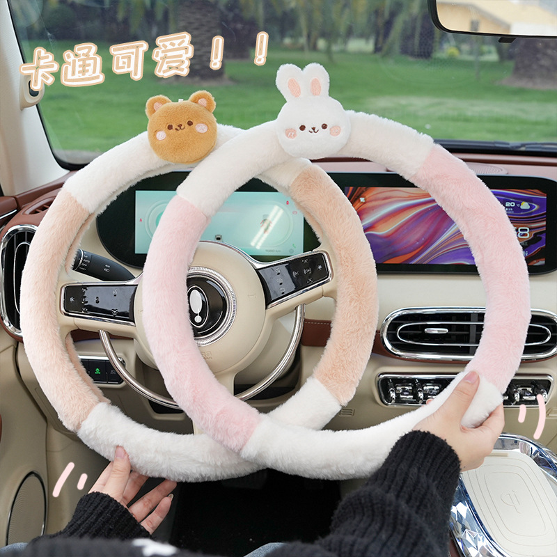 Winter Car Steering Wheel Cover Cartoon Cute Four-piece Bear And Rabbit Warm Car Handlebar Cover Anti-slip Hand Warmer Steering Wheel Cover