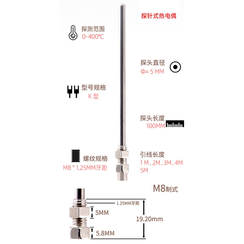 High Temperature Resistant KType Thermocouple M8 Stainless Steel Probe Temperature Probe0-400 Degrees Diameter5mm Temperature Sensor
