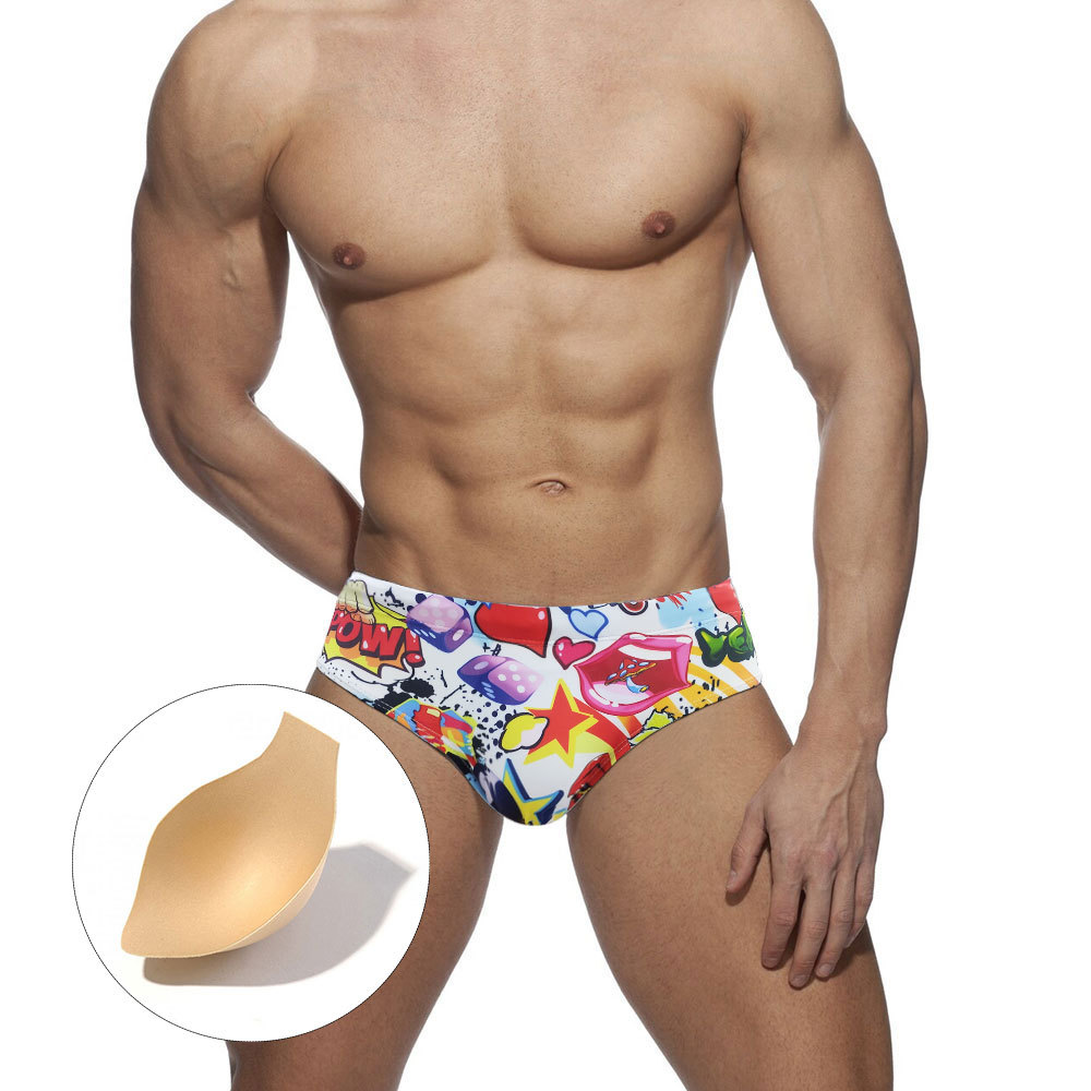 UXHEuropean And American Graffiti Cartoon Print Sexy Triangle Swimming Trunks With Cup To Prevent Embarrassment Adult Ready-made Foreign Trade Swimsuit