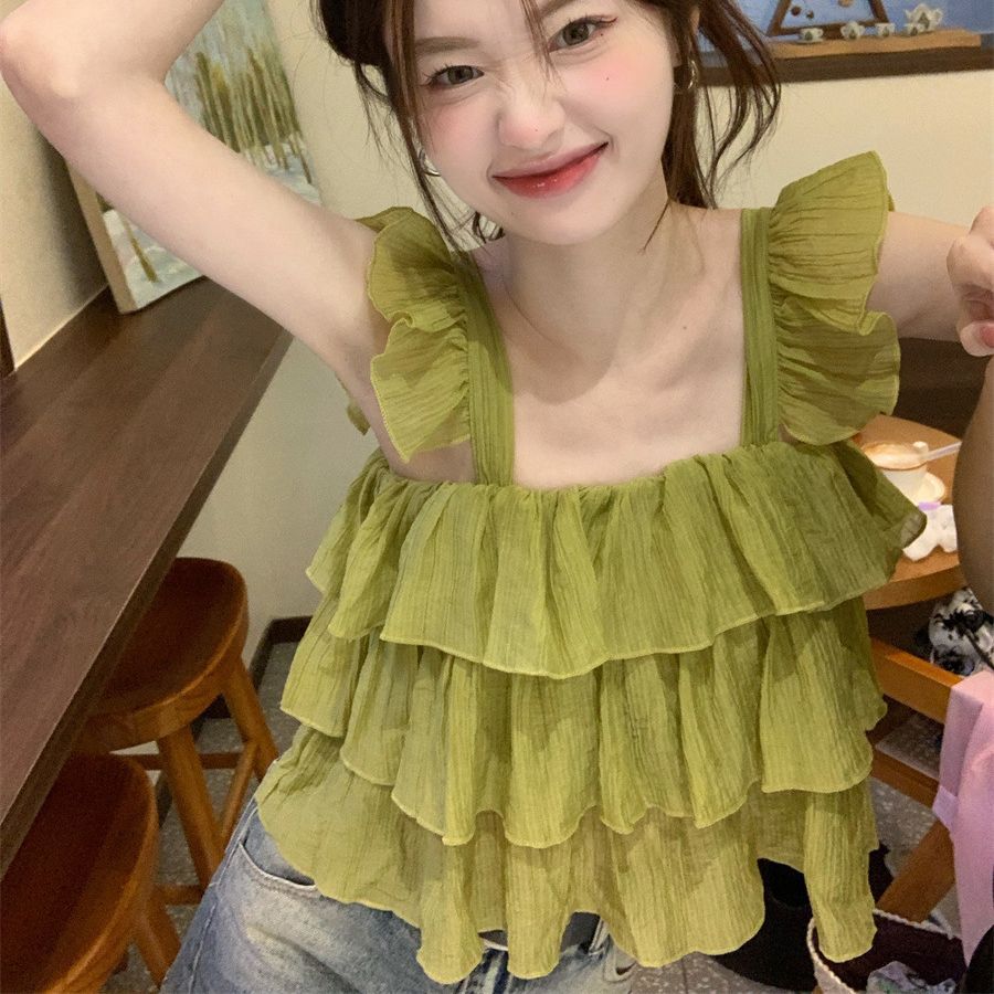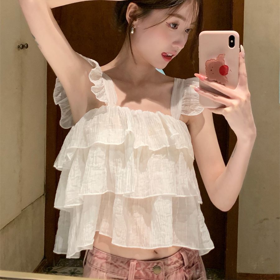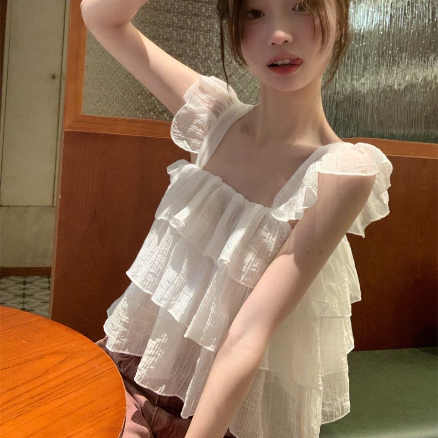 French Sweet Ruffle Camisole Women's Summer Outer Wear Sweet Hot Girl Design Small Flying Sleeves Sleeveless Short Top