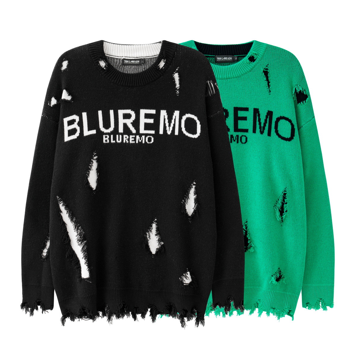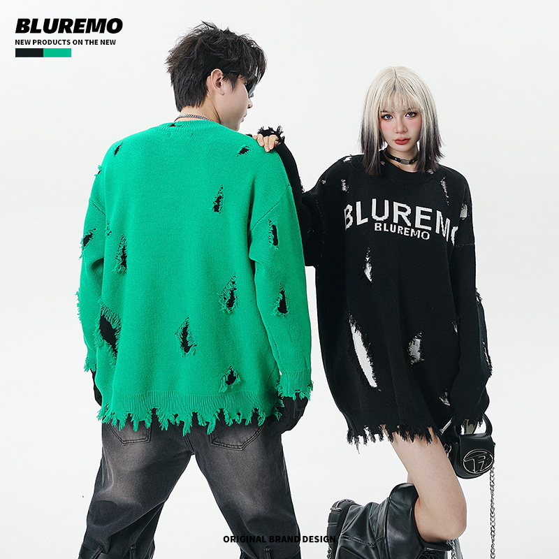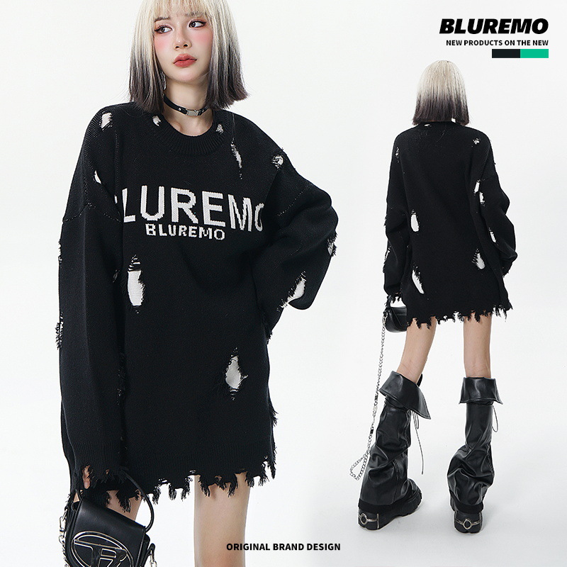 BLUREMO|Autumn And Winter American Street Fashion Heavy Letter Jacquard Round Neck Sweater High-end Ripped Pullover Sweater