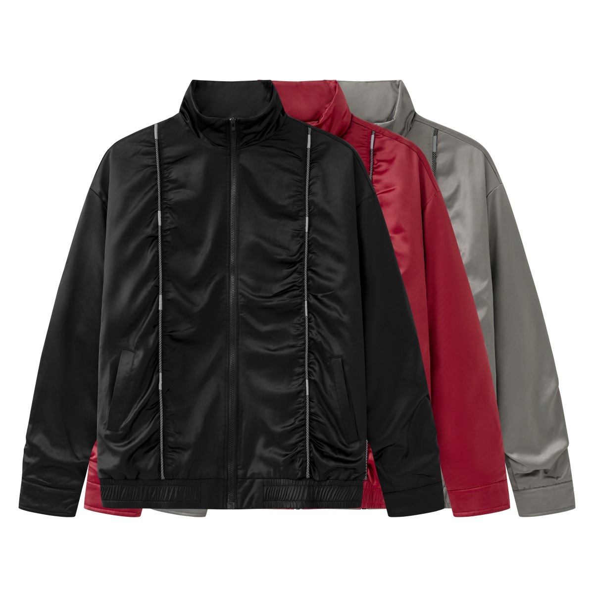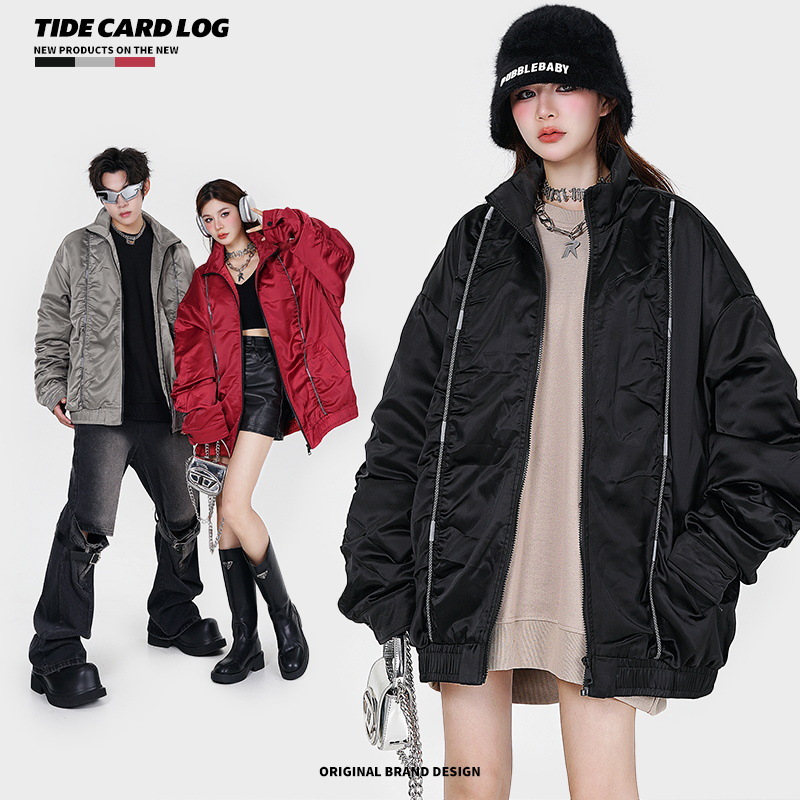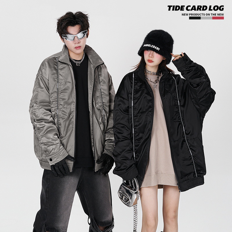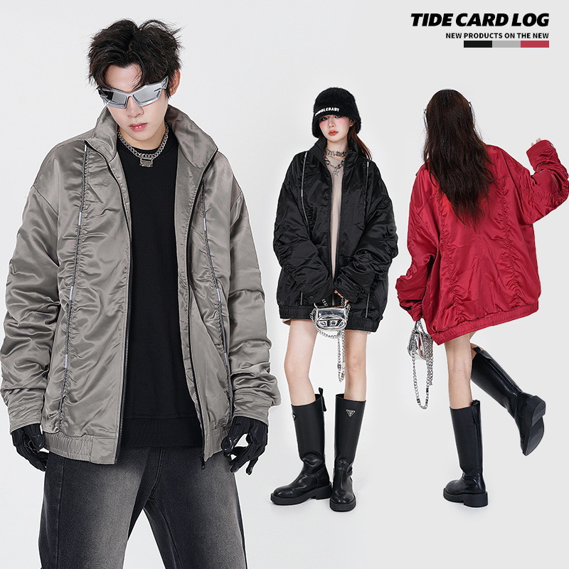 TIDECARDLOG|American Stand-up Collar Jacket,Retro High Street Glossy Zipper Couple Style Thickened Cotton Jacket
