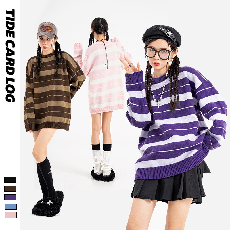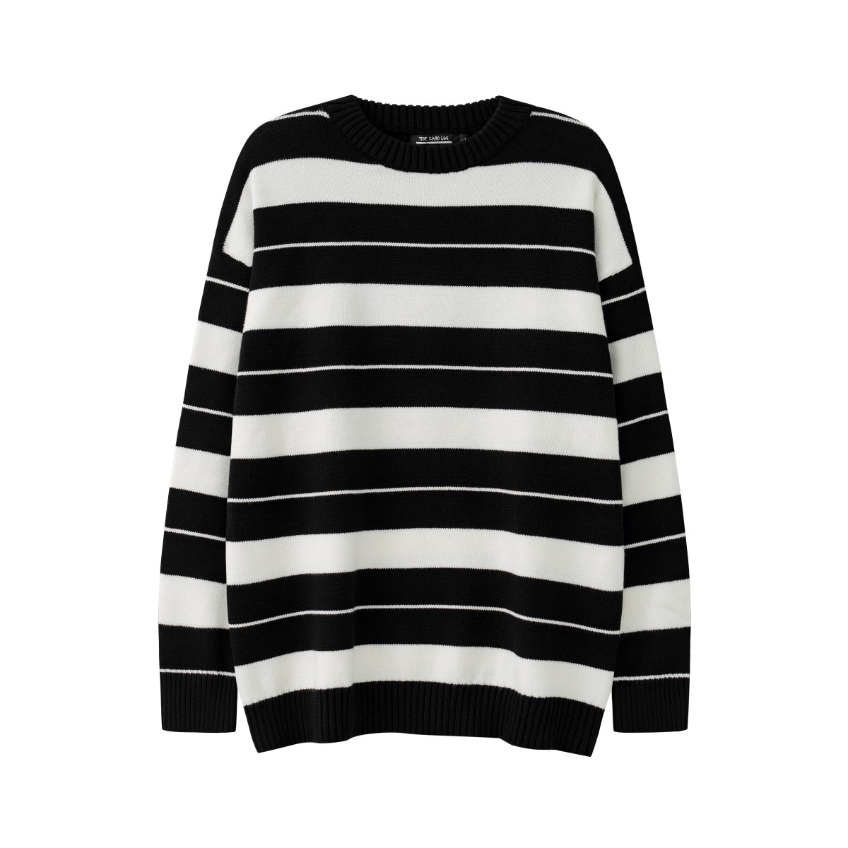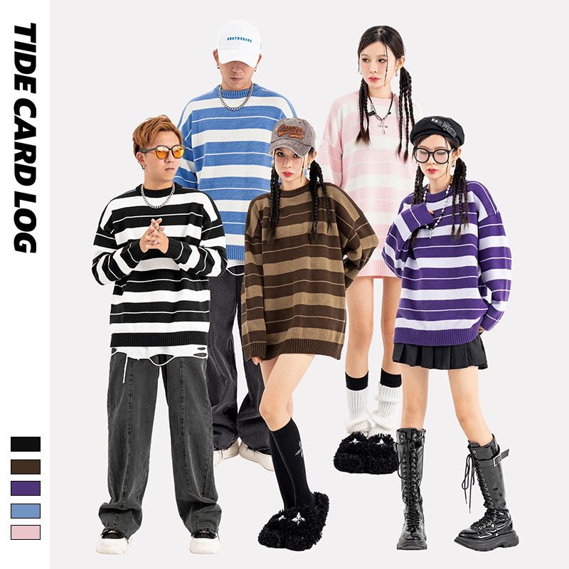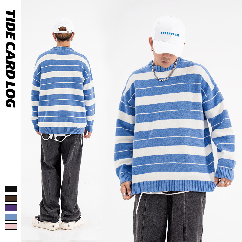 TIDECARDLOGNational Contrast Thick Striped Round Neck Sweater Autumn And Winter Retro Jacquard Men's And Women's Sweater