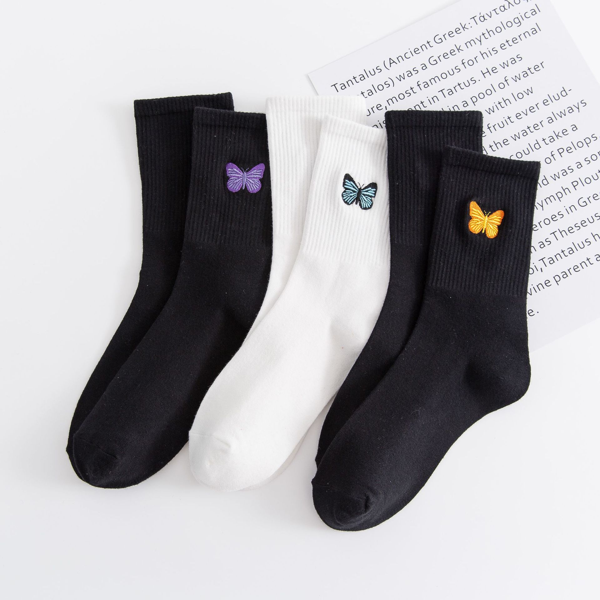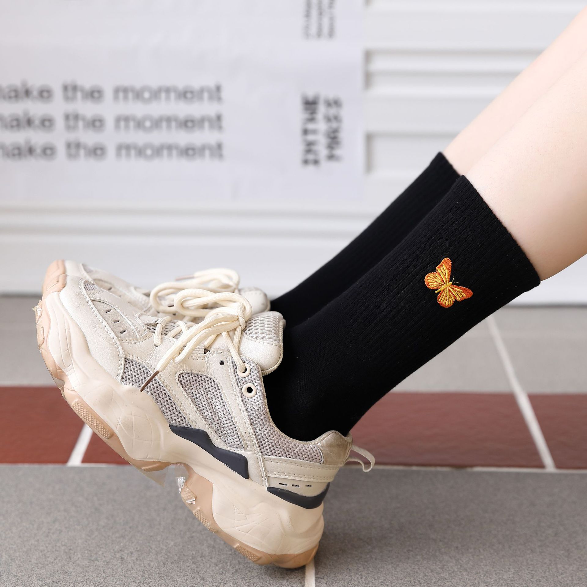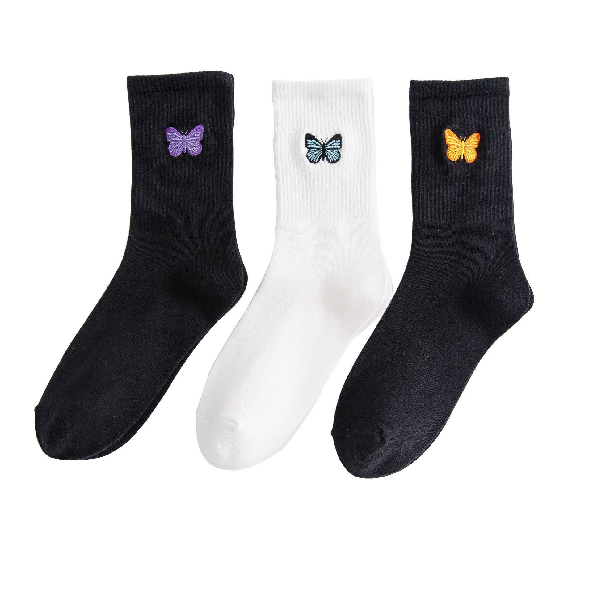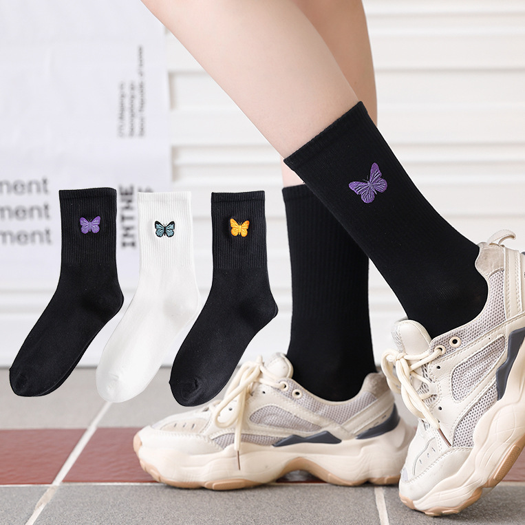 Embroidered Butterfly Socks For Women Autumn And Winter High Elastic Solid Color Mid-tube Socks Personalized Cotton YSocks Women's Socks