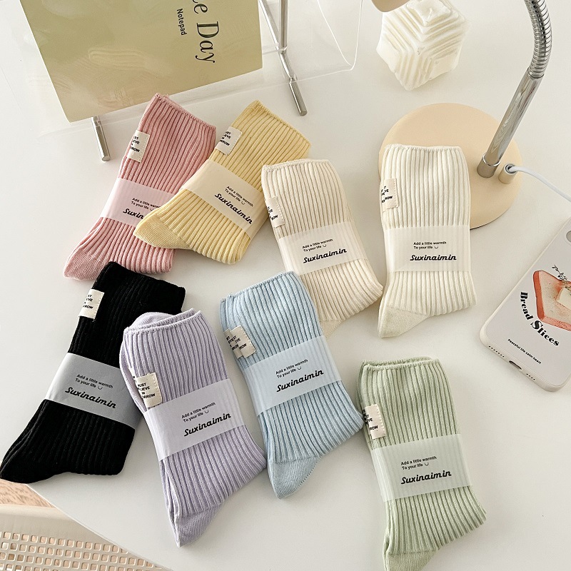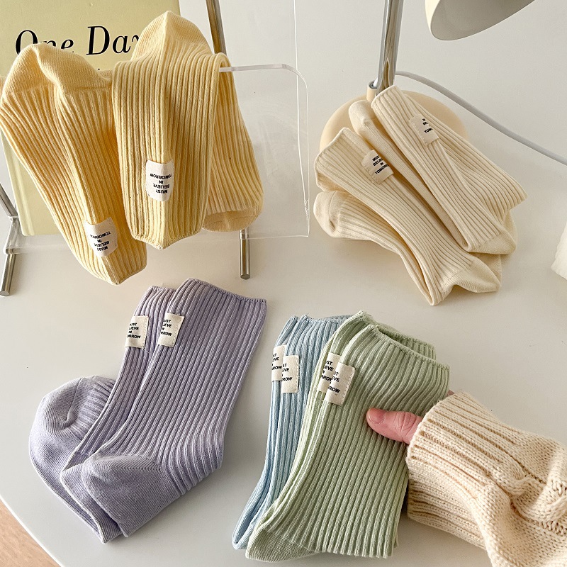 Socks For Women,Spring And Summer,Double-needle Pile Socks,Japanese Heel Cloth Label,Macaron Color Mid-calf Socks,Solid Color,Versatile Stockings