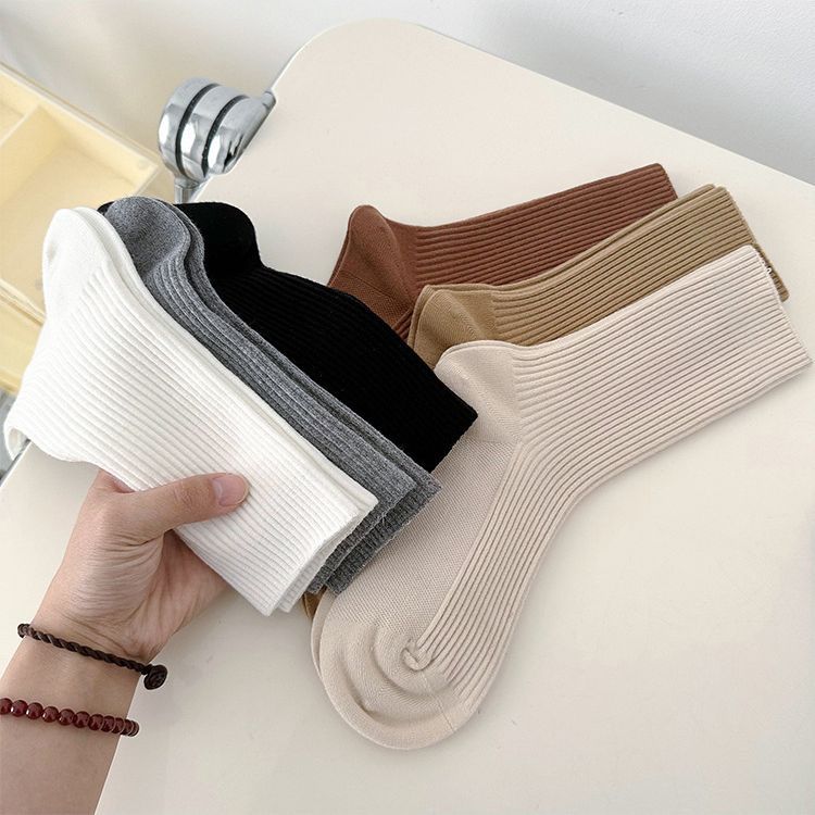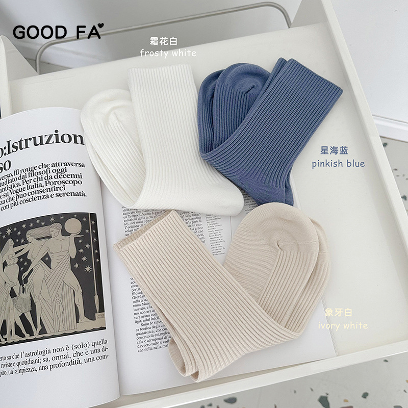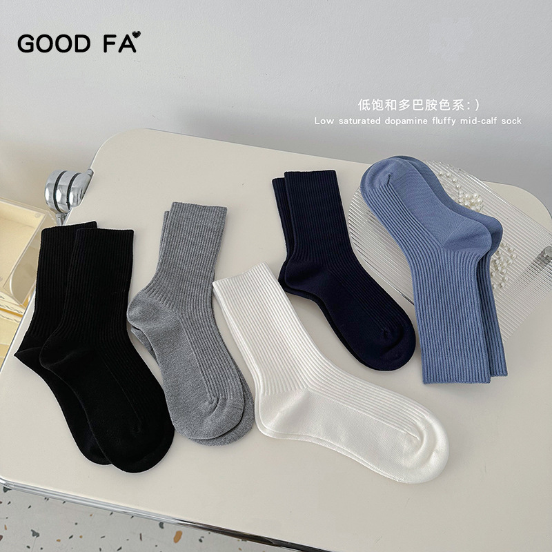 GOODFAAutumn And Winter Vertical Strip Basic Solid Color Pile Socks Dopamine Mid-tube Cotton Socks