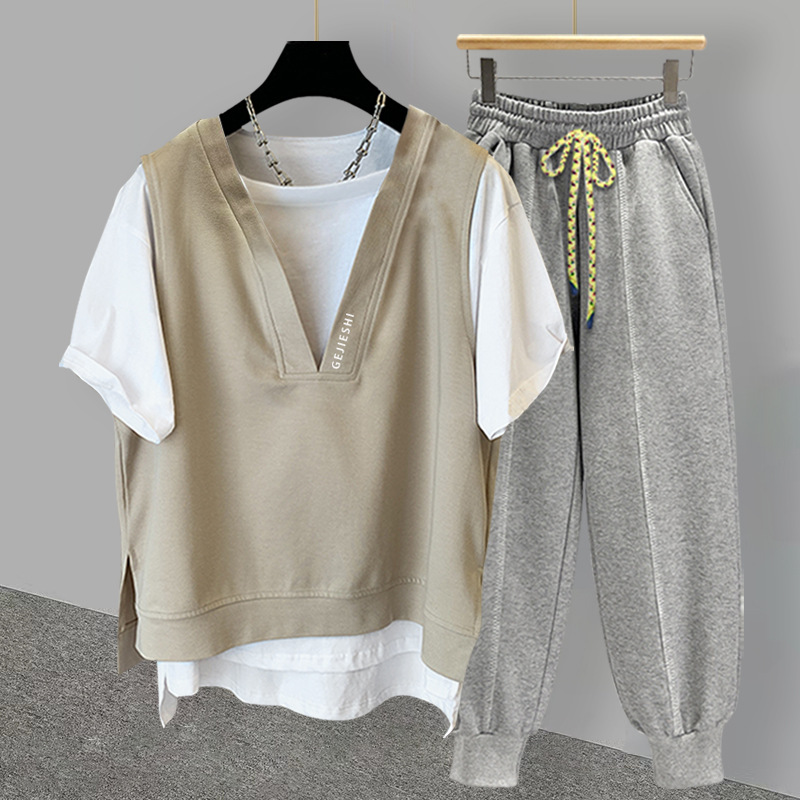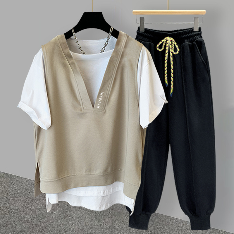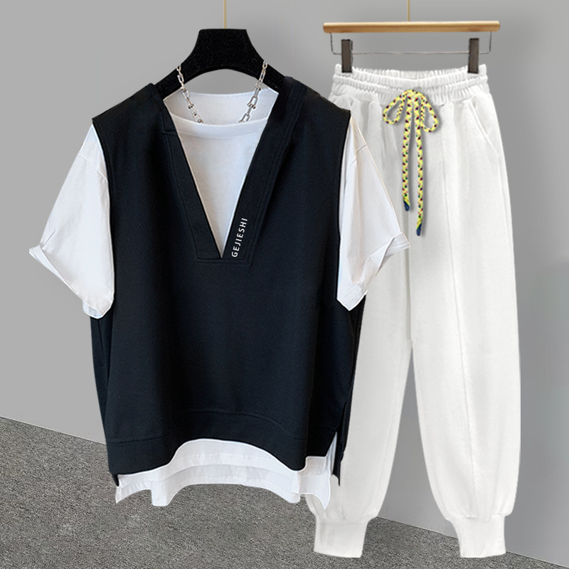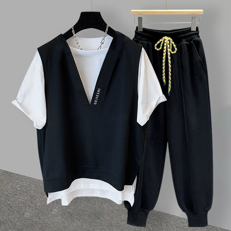 Fake Two-piece T-shirt Suit For Men In Summer,Korean Version,Casualy Embroidery,Versatile Short-sleeved,Loose,Complete Set For Students