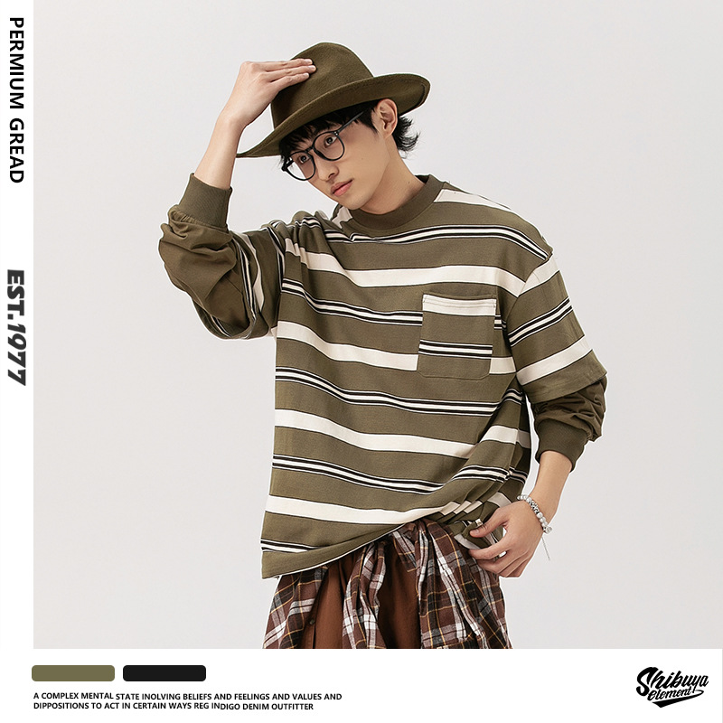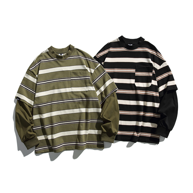 Spring And Autumn Youth Fake Two-piece College Style Round Neck Thin Casual Sweater Men's Loose Striped Street Fashion Tops