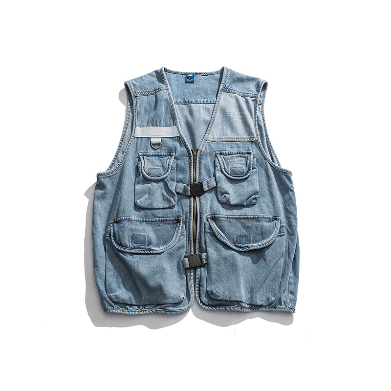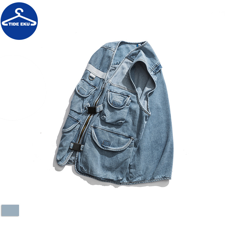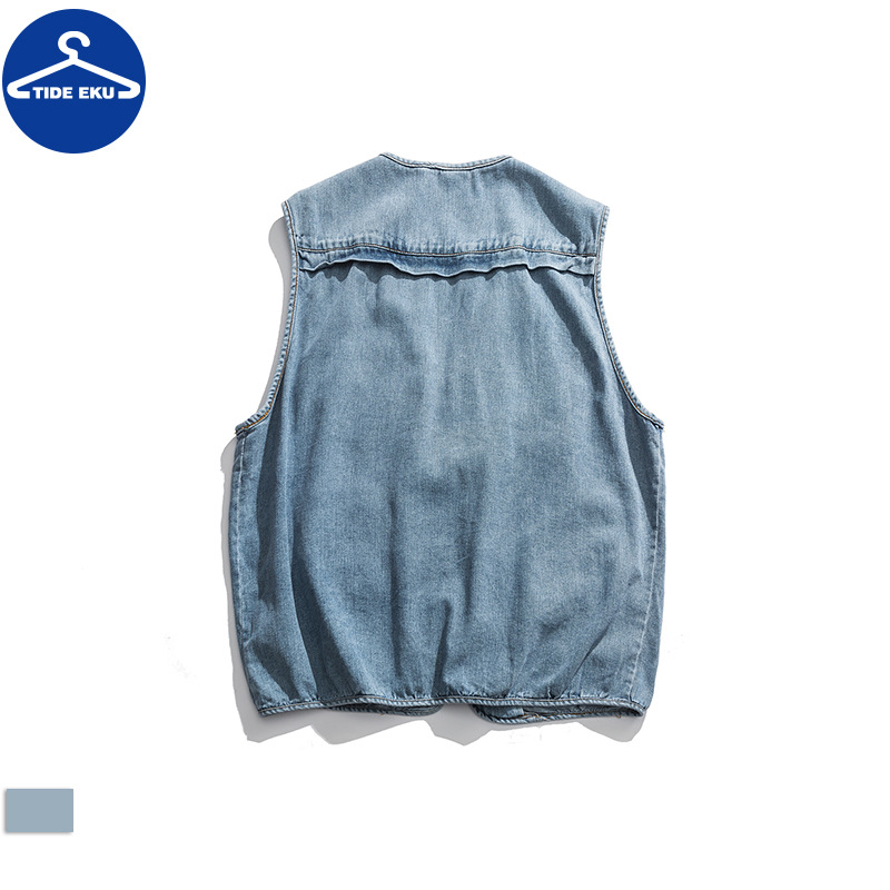 TIDEEKUDenim Work Vest Men's V-neck Outer Wear Hong Kong Style Retroy Brand Zipper Casual Jacket Stacked Waistcoat