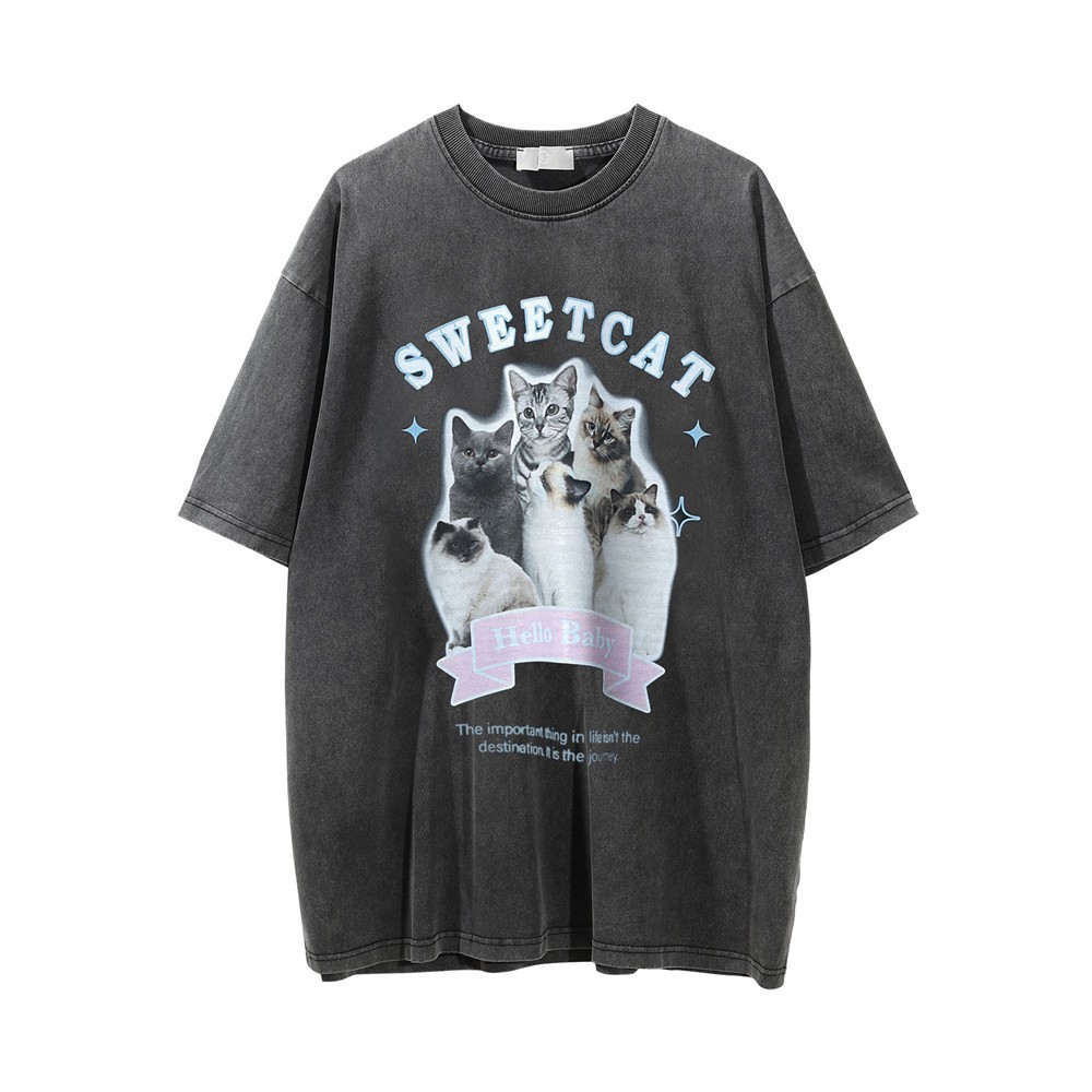 Animal Kitten Print Distressed Washed Short-sleeved T-shirt For Men Summer Casual Loose Round Neck T-shirt Top Street