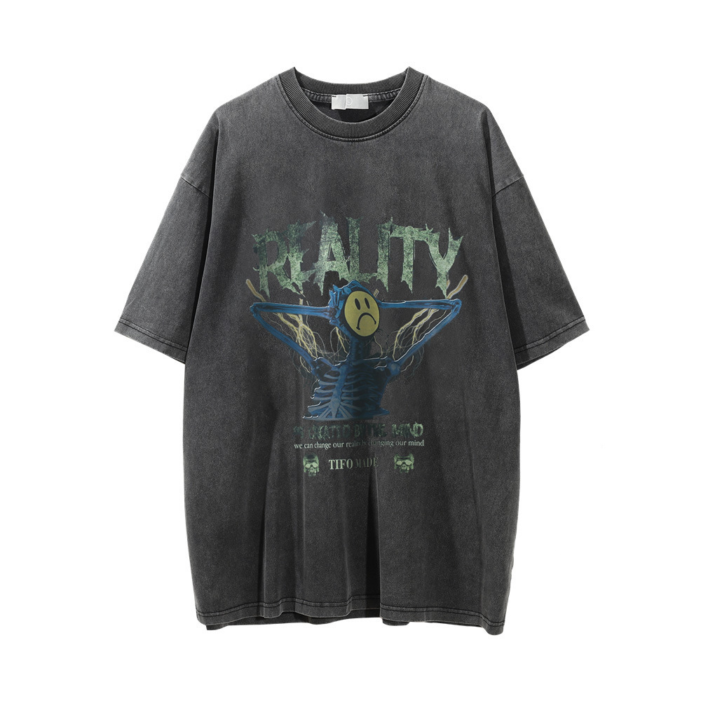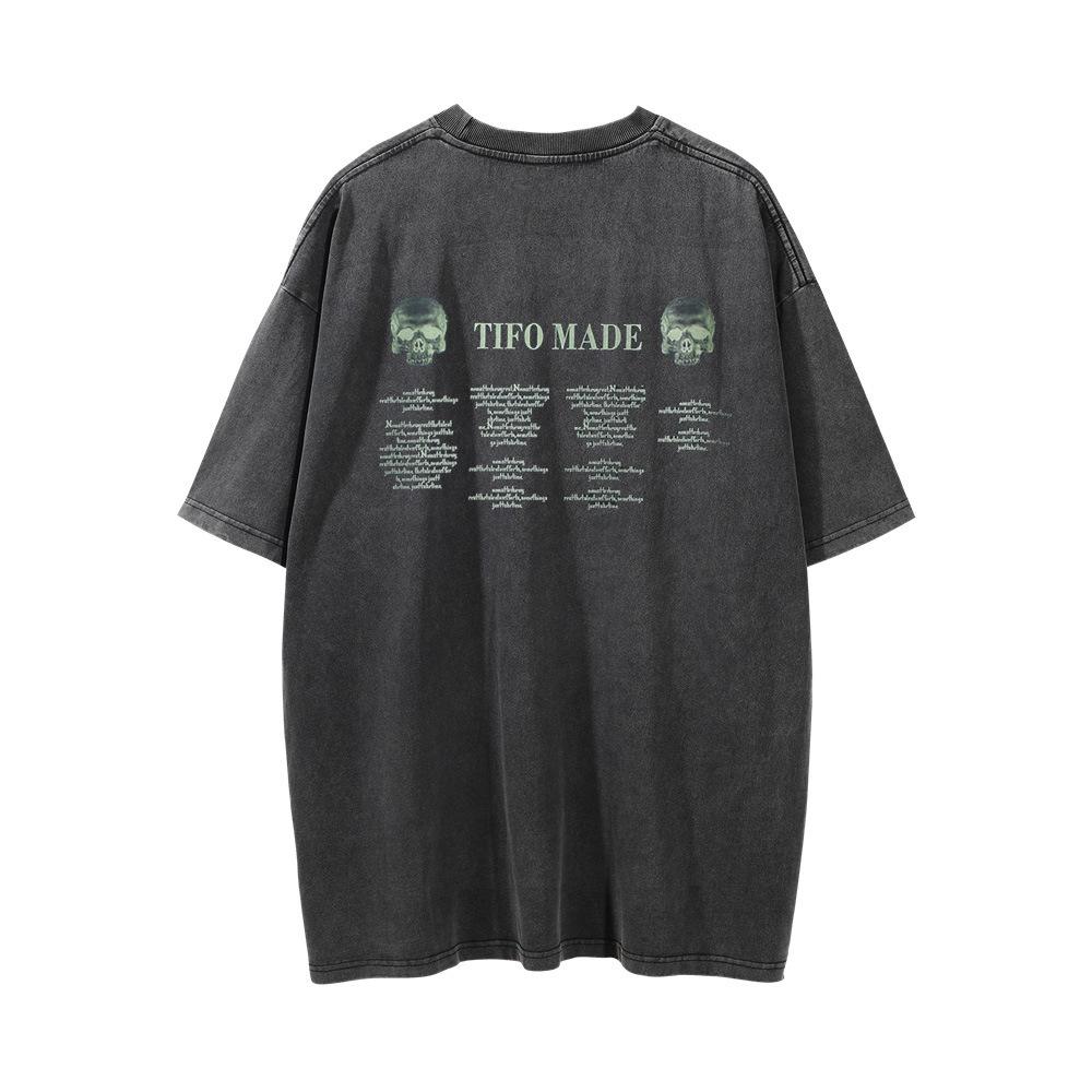 Dark High Street Skull Print Short-sleeved T-shirt Men's Summer Loose Washed Distressed Round Neck Short-sleeved T-shirt