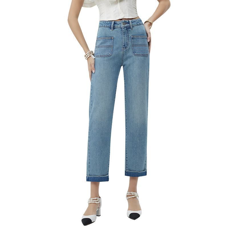 HEY+JEANSHigh-end Jeans Women's Spring And Autumn Curled Square Front Pocket Anti-wrinkle Nine-point Straight Pants
