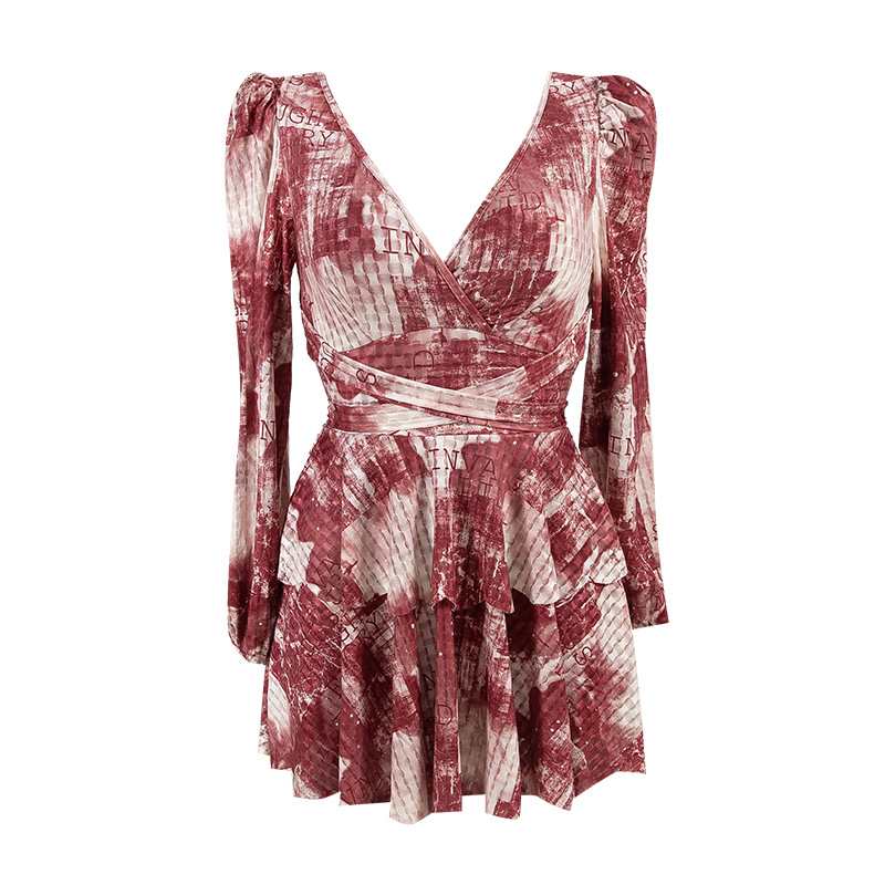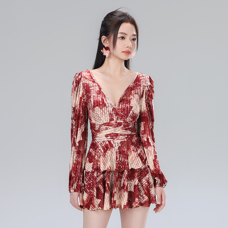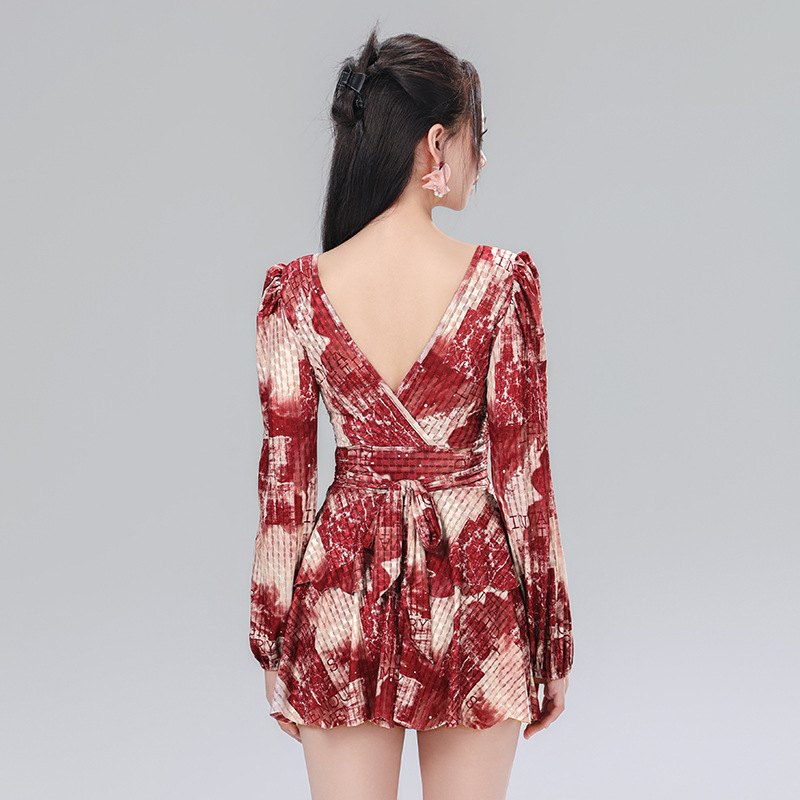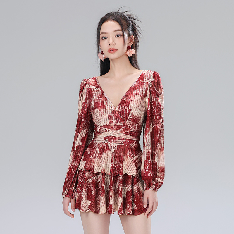 NAILANG24 Swimsuit Women's Long-sleeved Body-covering Sun Protection Conservative Body-covering V-tie Steel Support Gathered Belly-covering Burgundy