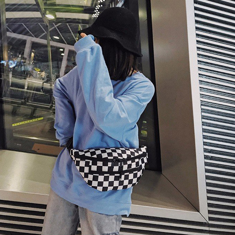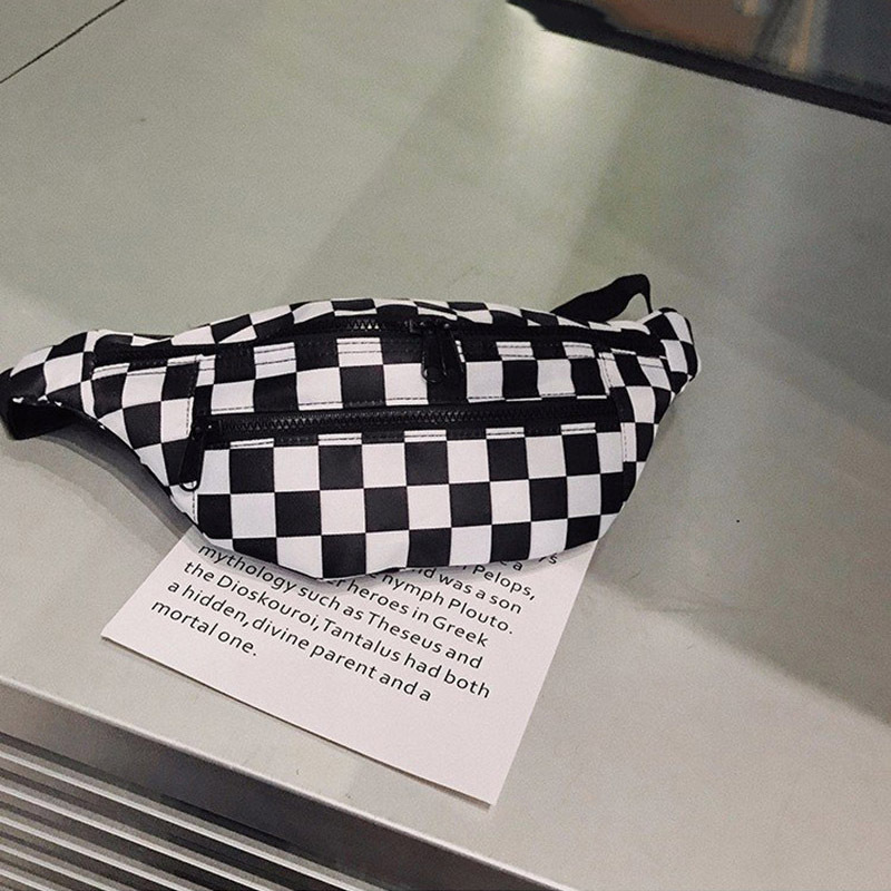 Checkerboard Black And White Plaid Waist Bag For Women Fashion Crossbody Small Bag Canvas Chest Bag Double Zipper
