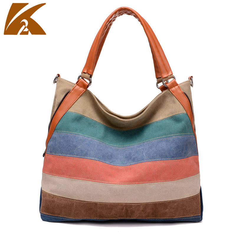 Korean Style Preppy Canvas Women's Handbag Contrast Color Bag Striped Fashion Retro Large Capacity Shoulder Crossbody Bag