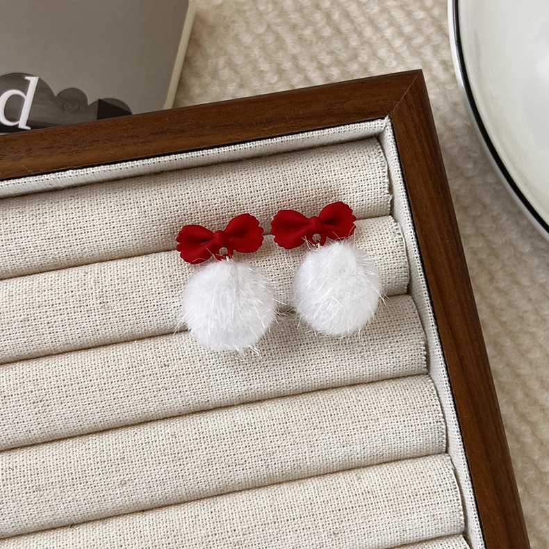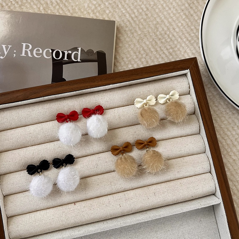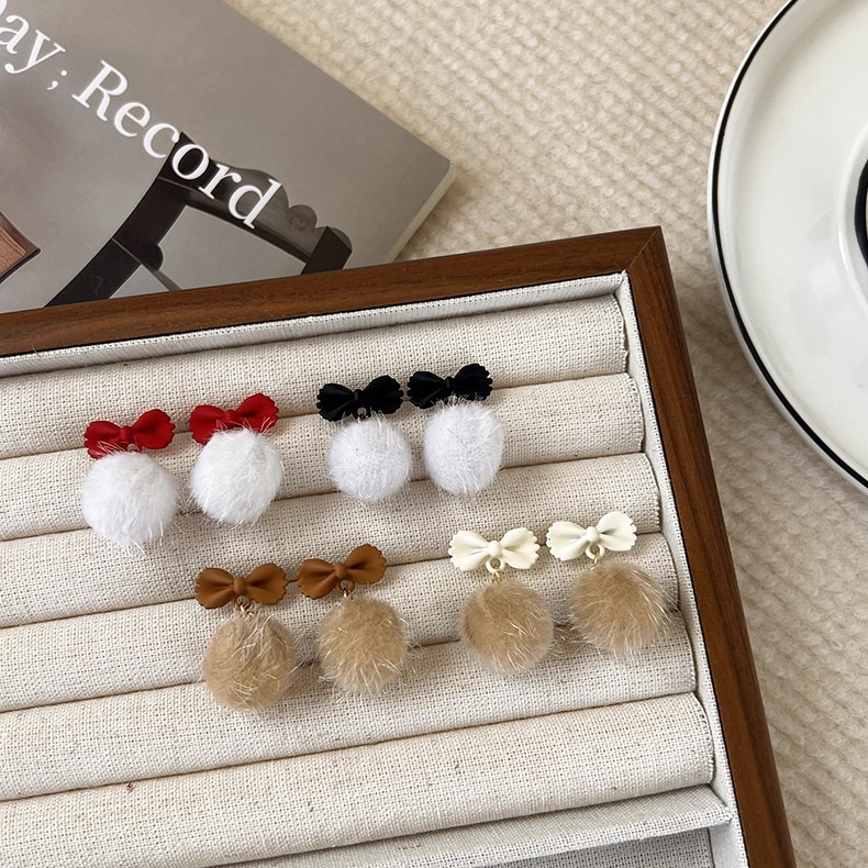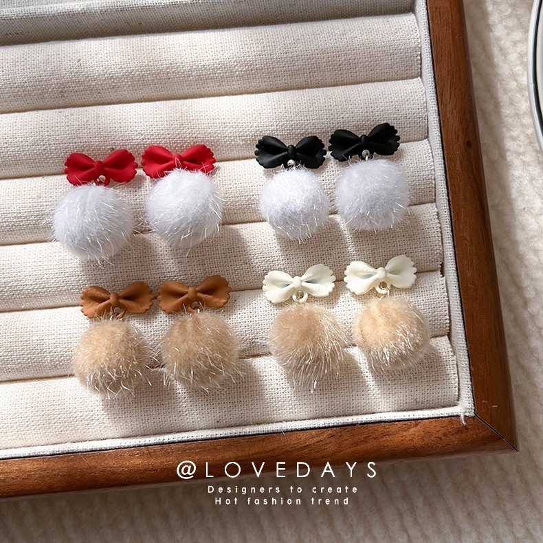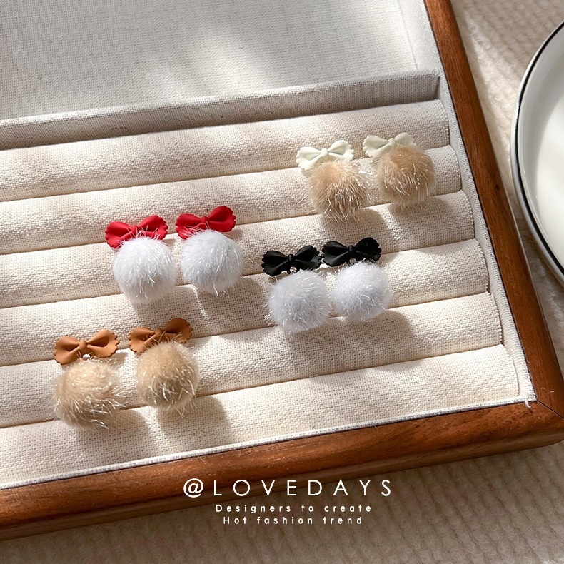 Star Style Bow Plush Ball Earrings Autumn And Winter Personality Plush Ball Earrings Plush Earrings For Women