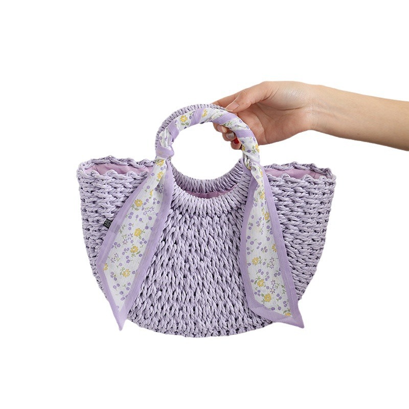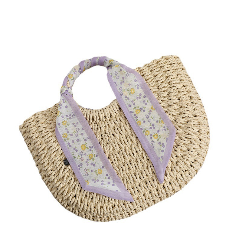 Style Small Fresh Purple Straw Bag Temperament Small Flower Silk Scarf Portable Woven Bag Holiday Beach Bag Women's Bag