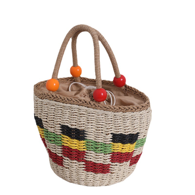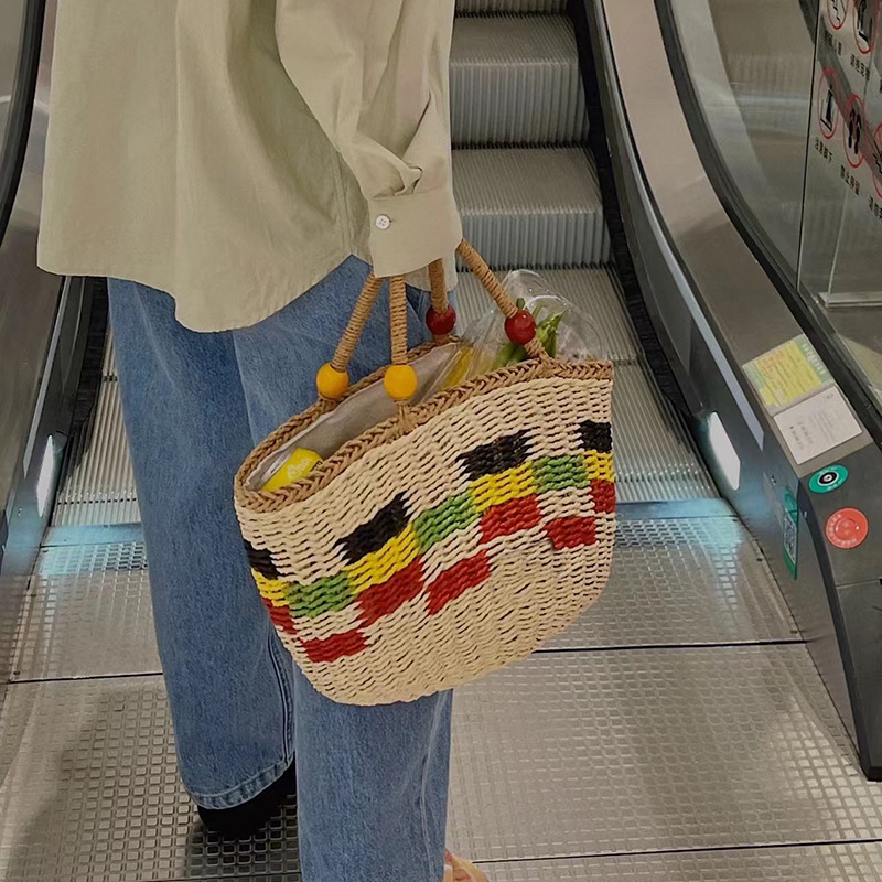 Cute Wooden Bead Portable Straw Bag,Small Fresh Colorful Plaid Hand-carried Woven Bag,Fruit Picnic Basket,Beach Bag