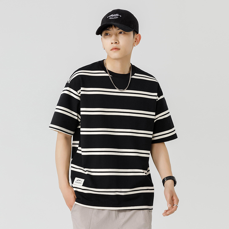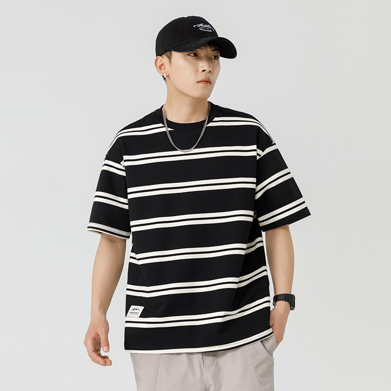 Kunhai Pengyun Japanese Heavyweight Black And White Striped Short-sleeved T-shirt Men's Spring And Summer Retro Couple Wear Half-sleeved T-shirt