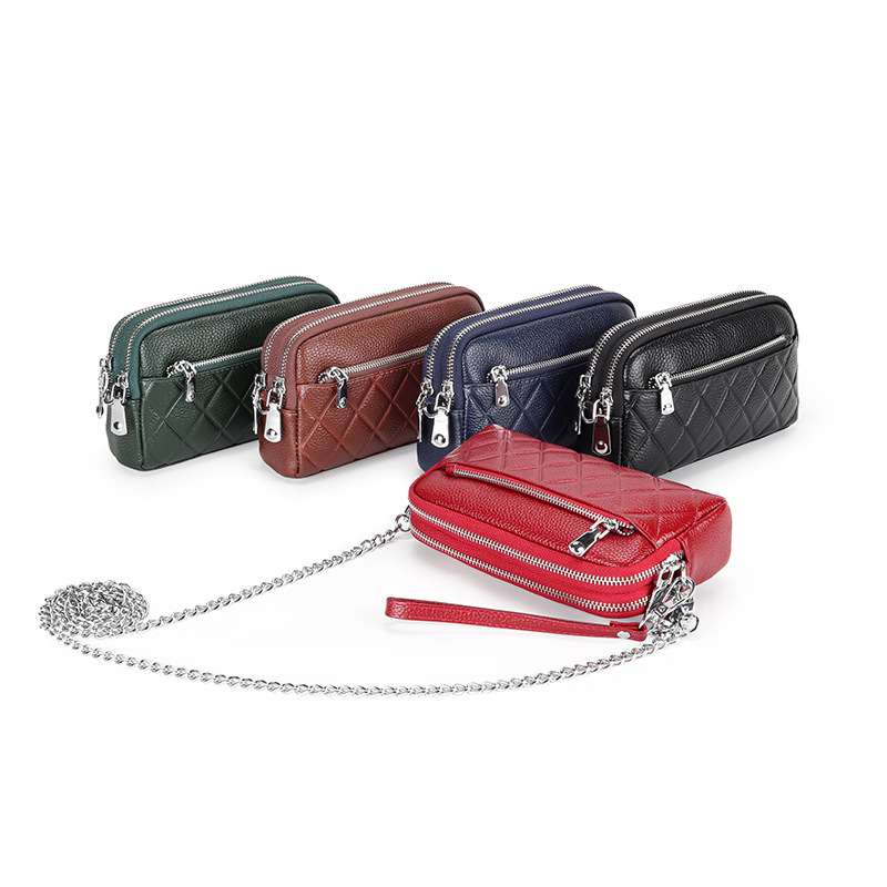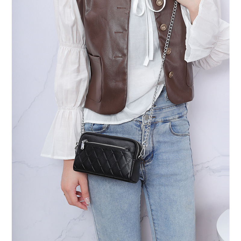 Genuine Double-layer Small Handbag For Women Diamond Chain Crossbody Bag Cowhide Multifunctional Hand Mobile Phone Wallet