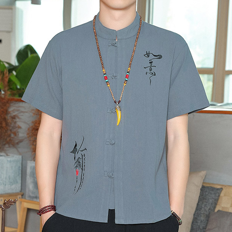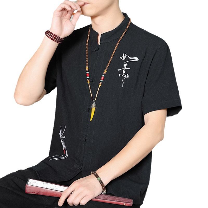 Summer Short-sleeved Shirt Men's Tang Suit Chinese Style Cotton And Linen Half-sleeved Top Youth Embroidered Plate Button Cardigan Clothes Linen