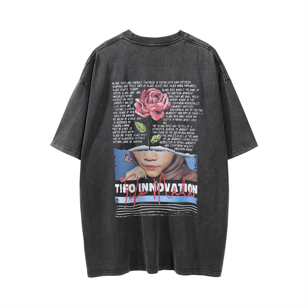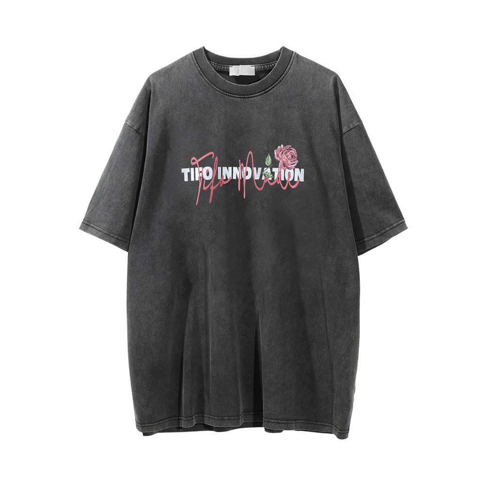 Rose Letter Printed Short-sleeved T-shirt Men's Casual Summer Old Washed Pullover T-shirt Hot Street Brand
