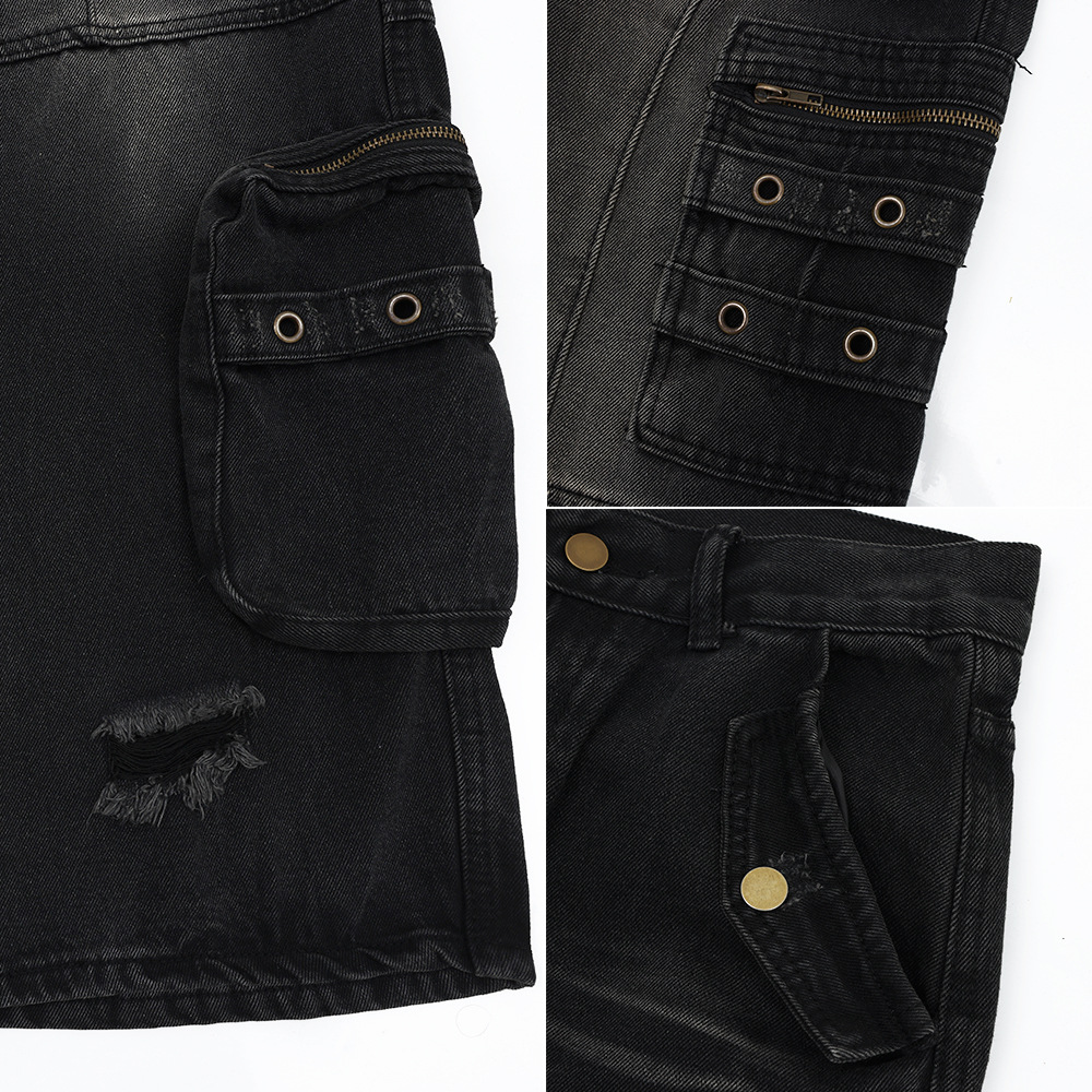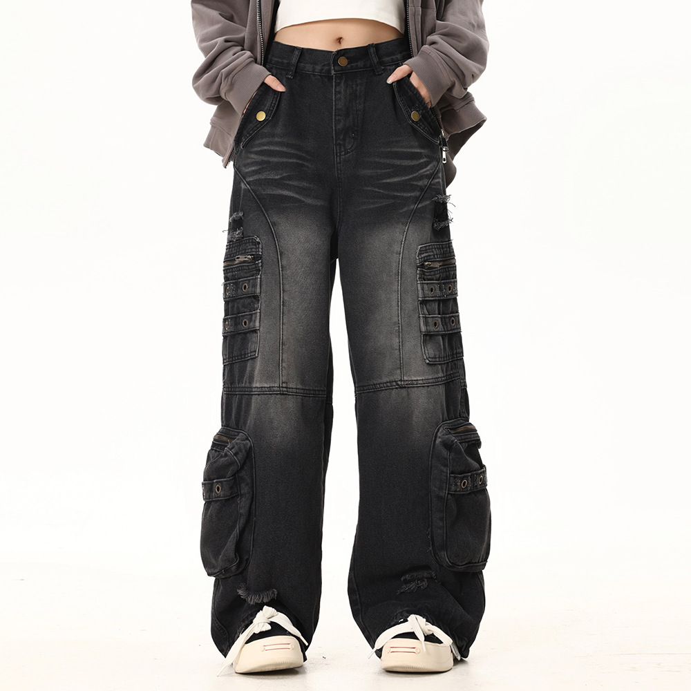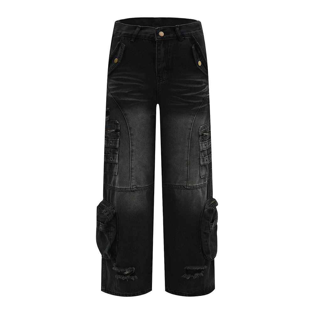 YBrand Washed Ripped Denim Overalls For Men And Women,Functional Three-dimensional Zipper Pockets,Wide-leg Straight Trousers For Men And Women
