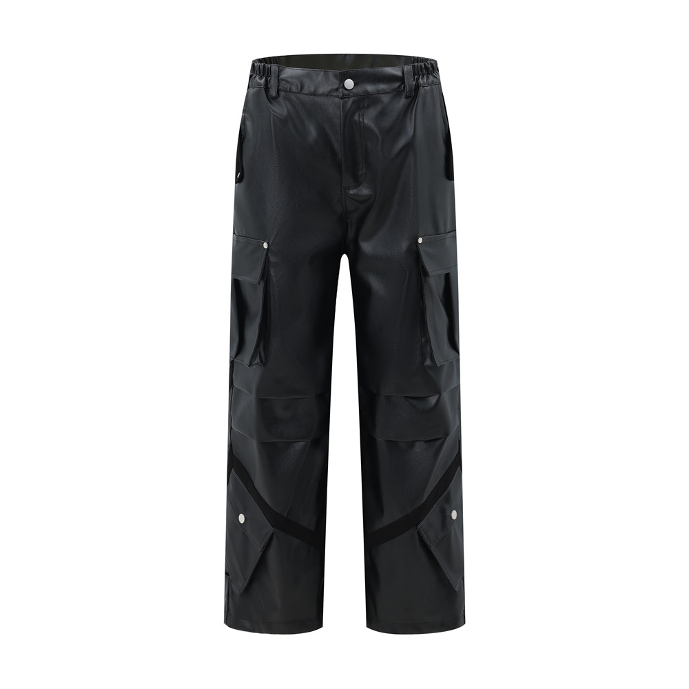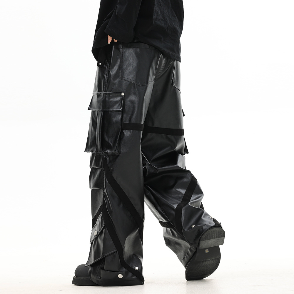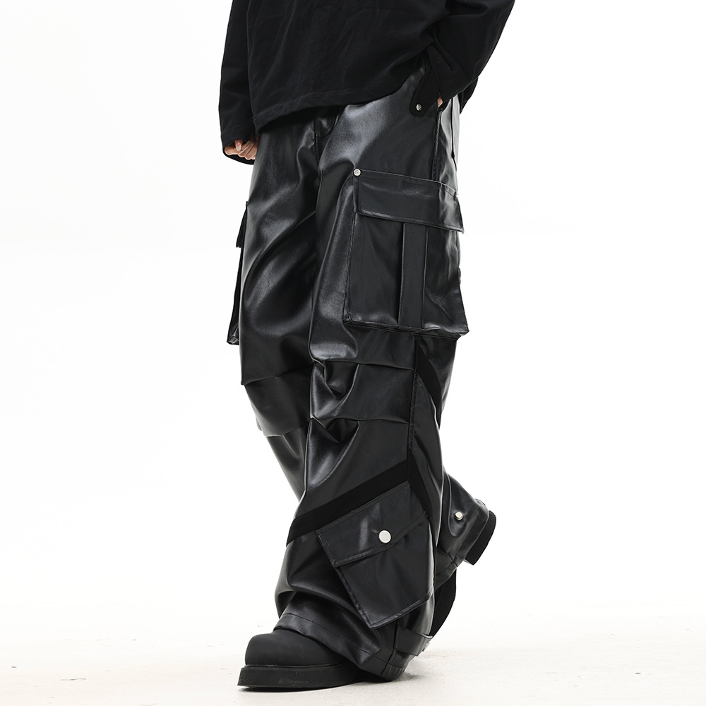 European And American Rock And Roll Workwear Leather Pants For Men And Women,Thickened High Street Pleated Design,Multi-pocket Loose Straight Trousers