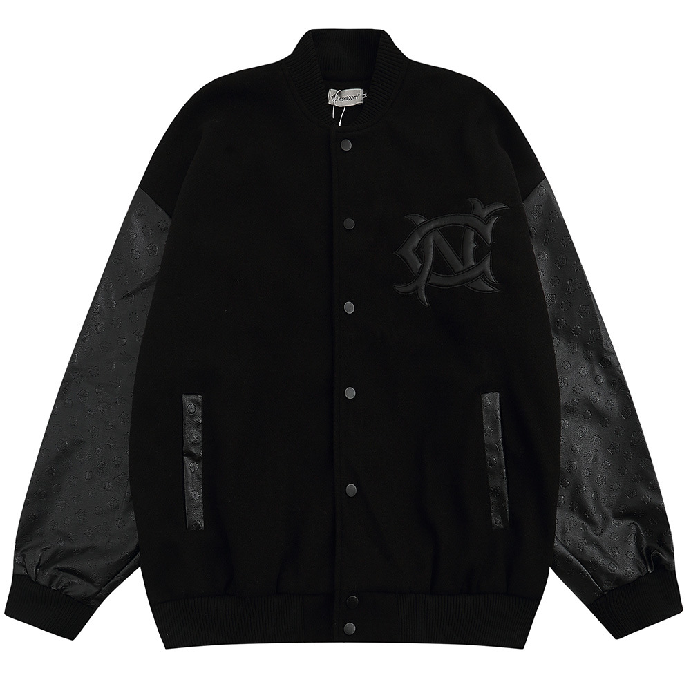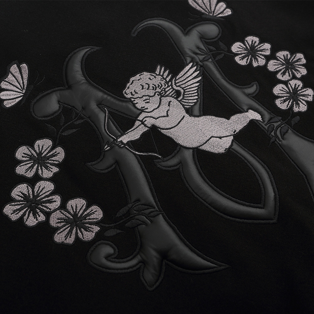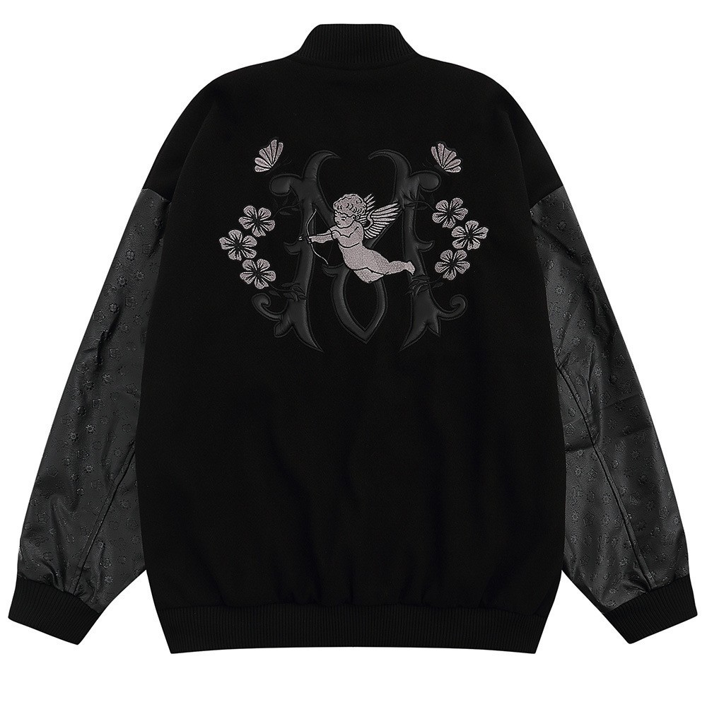 YAmerican Style Flocked Embroidered Little Angel Pu Leather Sleeve Baseball Jacket Men's Loose Hip-hop Lapel Jackety