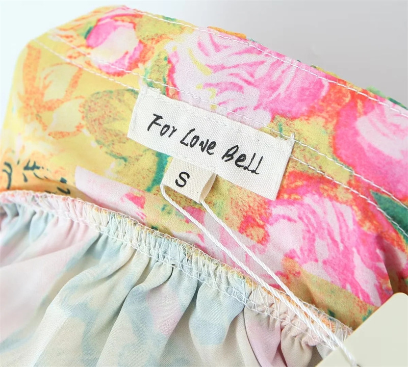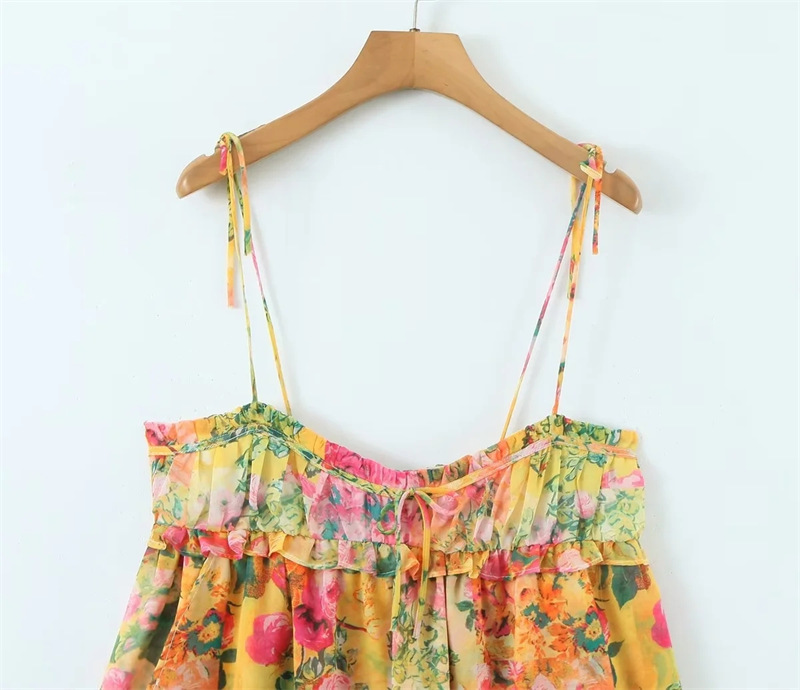 Double-shoulder Lace-up Dress French Niche Fungus-front Lace-up Color-blocked Floral Seaside Vacation Suspender Skirt