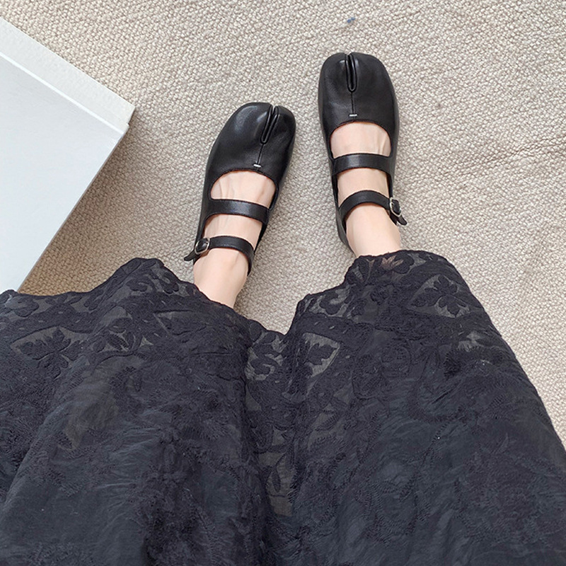 Grape Mom Autumn Double-breasted One-line Buckle Pig's Hoof Split-toe Shoes Mary Jane Design Single Shoes For Women