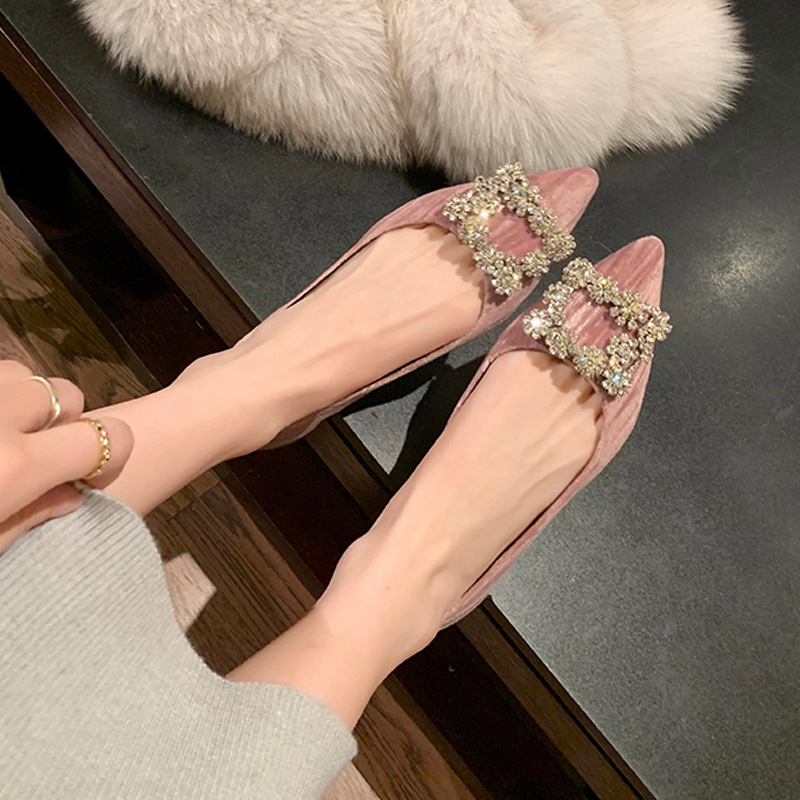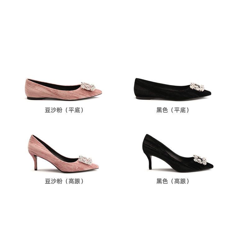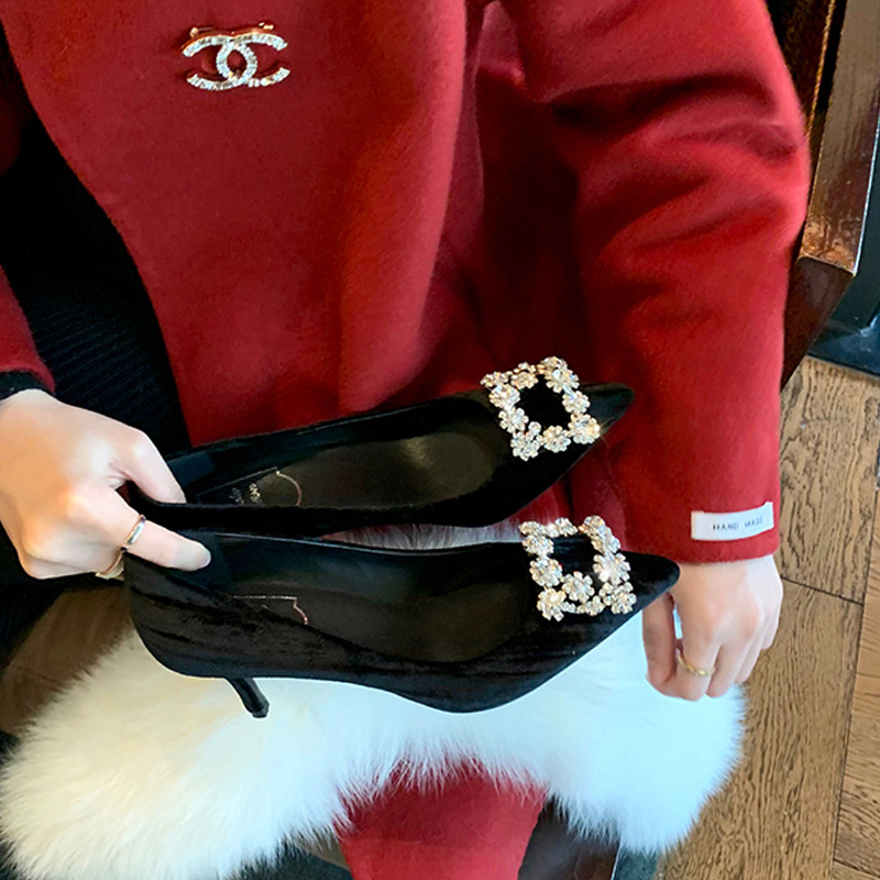 Spring Style French Velvet Stiletto Heels Shallow Mouth Pointed Toe Square Buckle Sparkling Diamond Single Shoes Wedding Shoes For Women