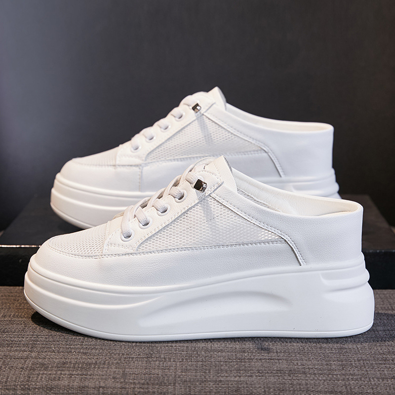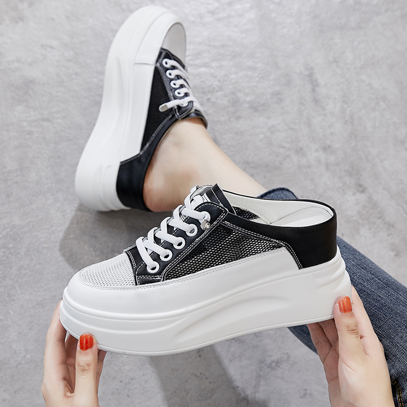 Genuine Leather Closed Toe Mesh Half Slippers For Women Summer Outdoor Wear Style Inner Heightening White Shoes Korean Style Fashion Mesh Slippers For Women