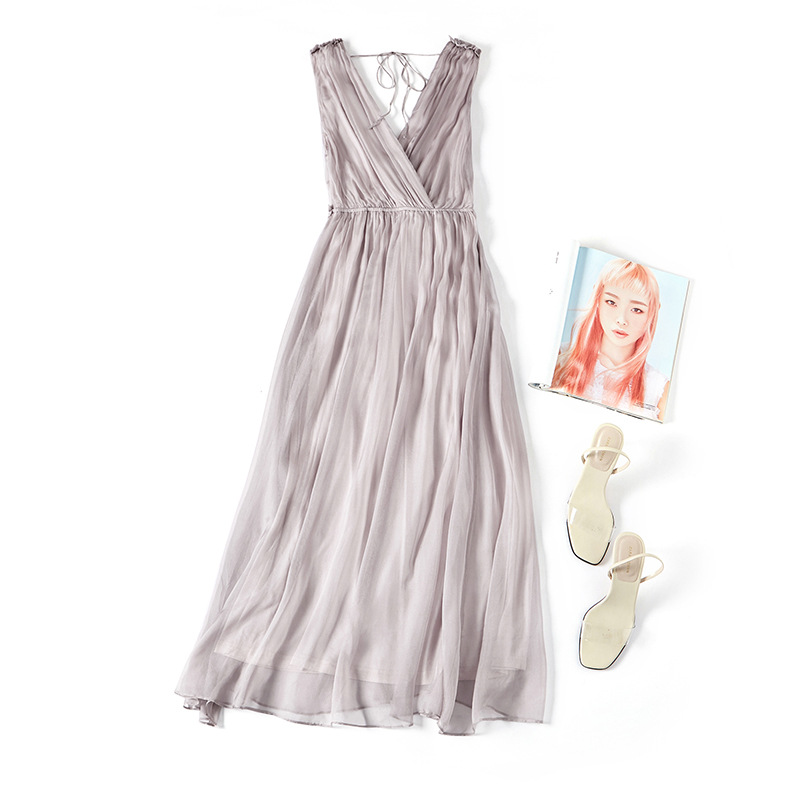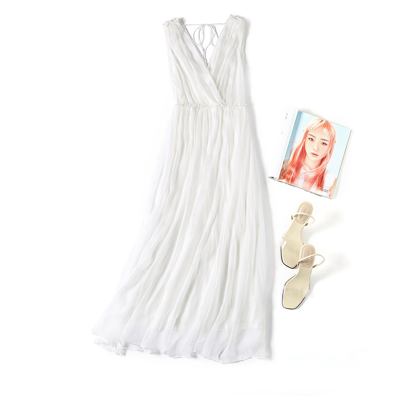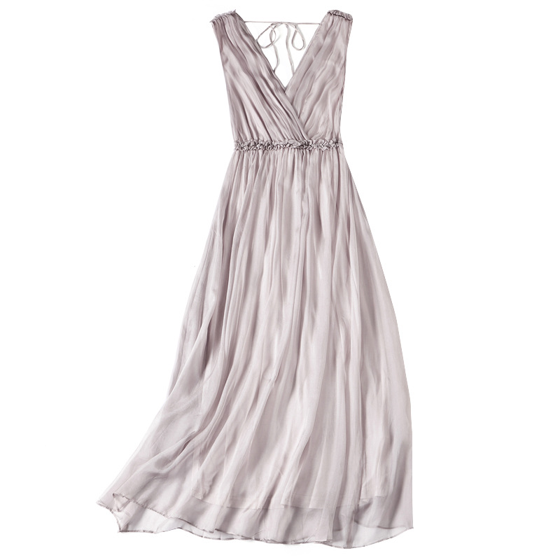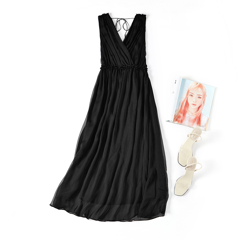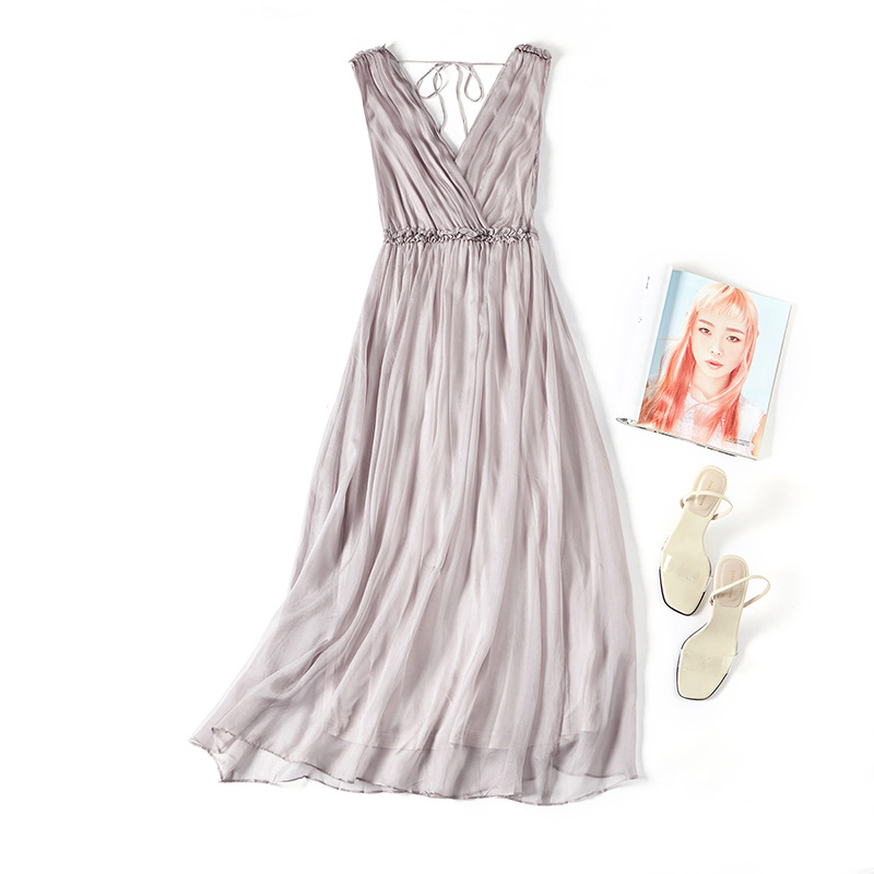 Mulberry Silk Shenzhen Dress Summer Women's Slim Sleeveless Swing Fashion V-neck Silk Midi Dress