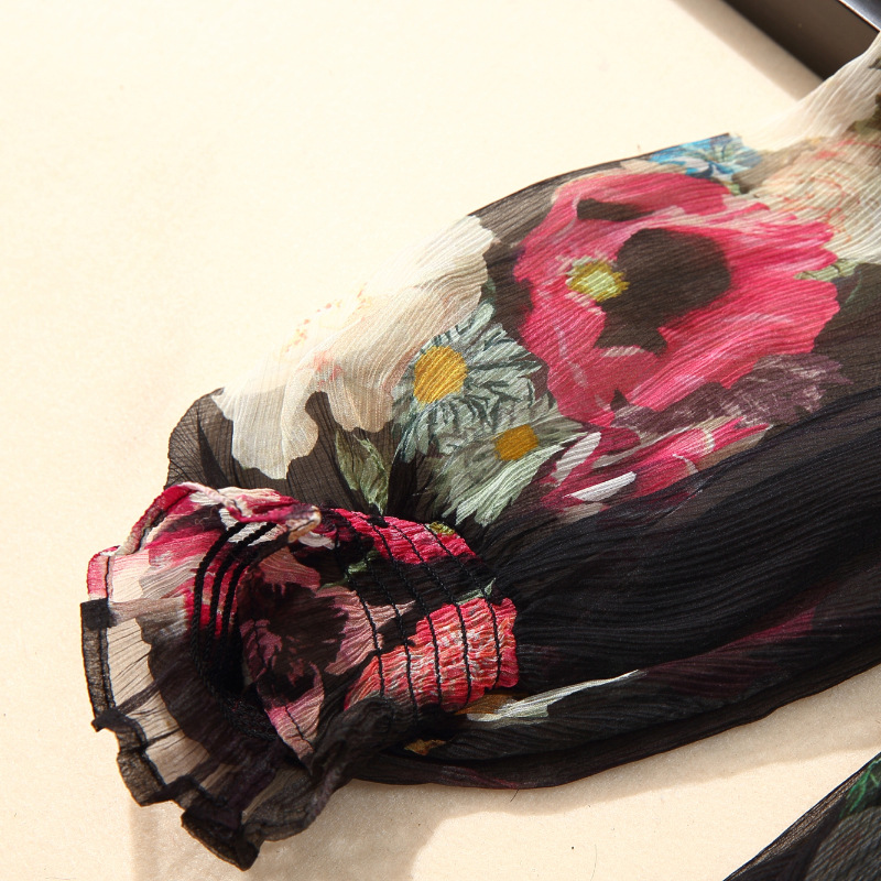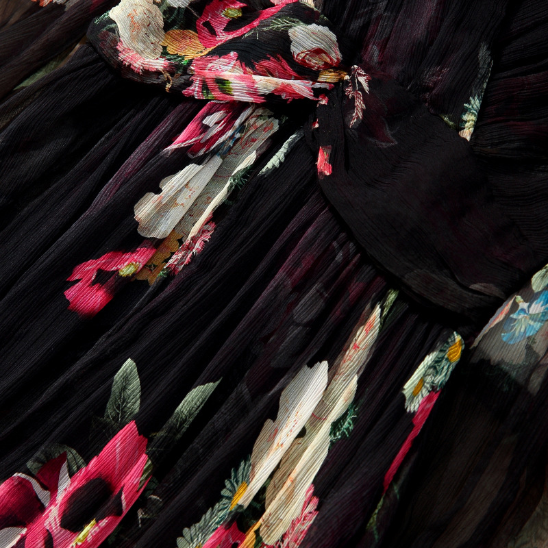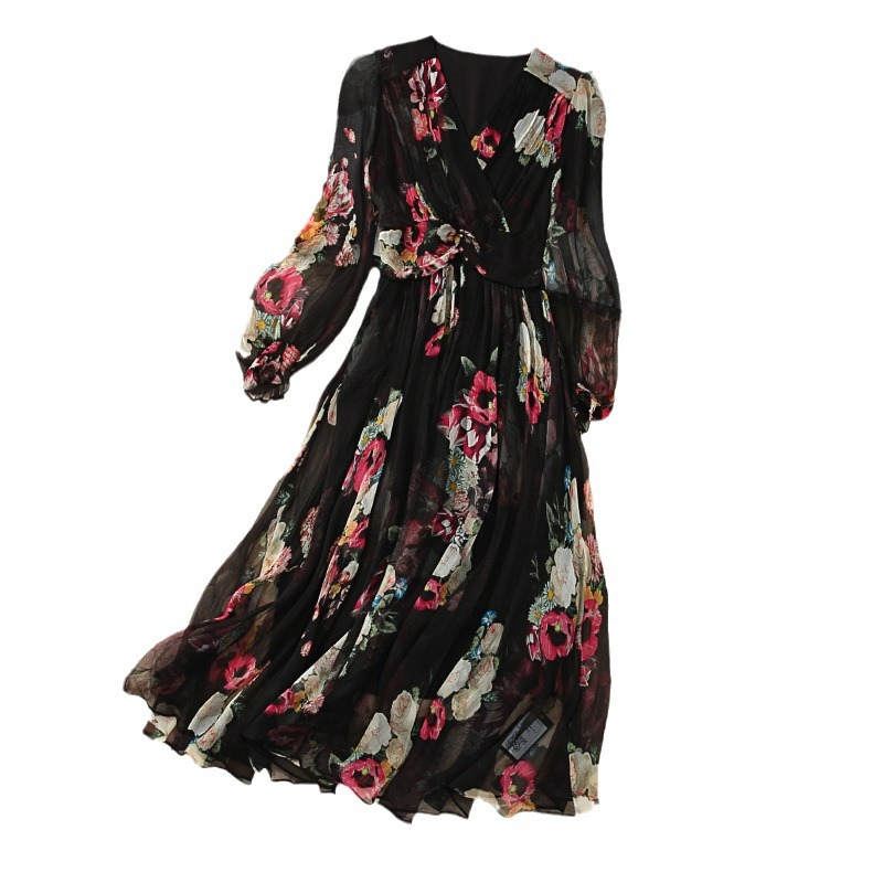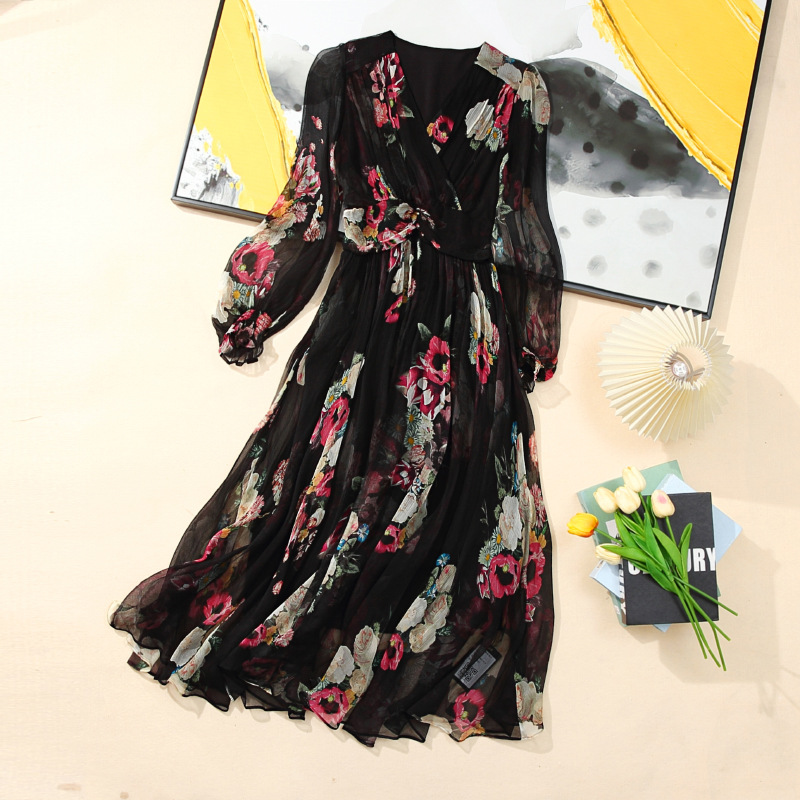 European Station24 Spring Show Fashion High-end Silk Print Long Dress French V-neck Slim Dress