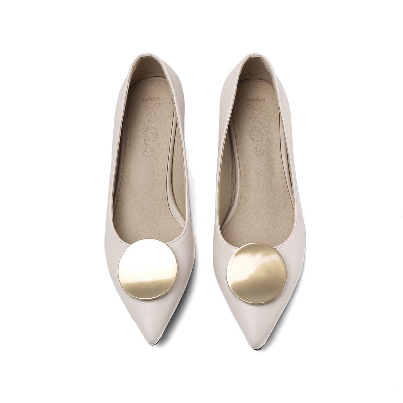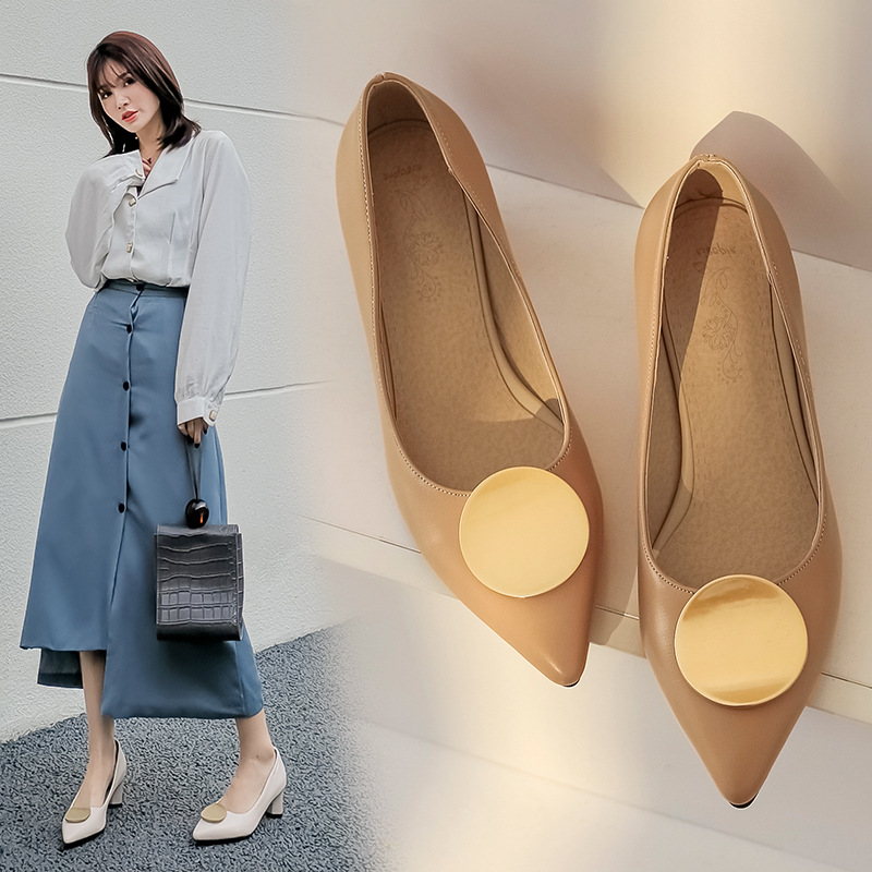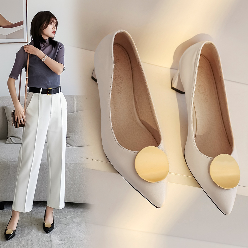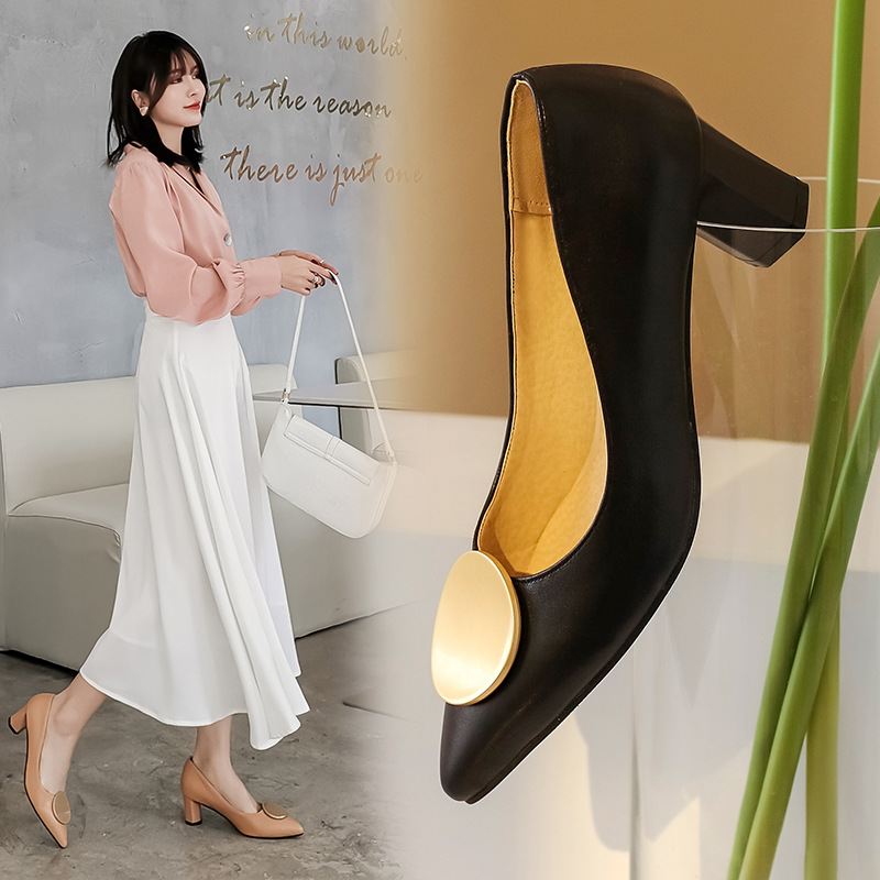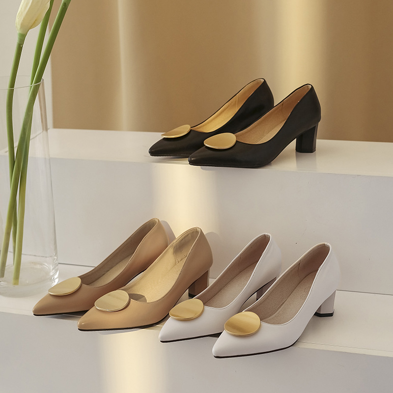 Large And Small Single Shoes For Women Ladies High Heels Metal Round Buckle Pointed Shallow Mouth Thick Heel Single Shoes T4302