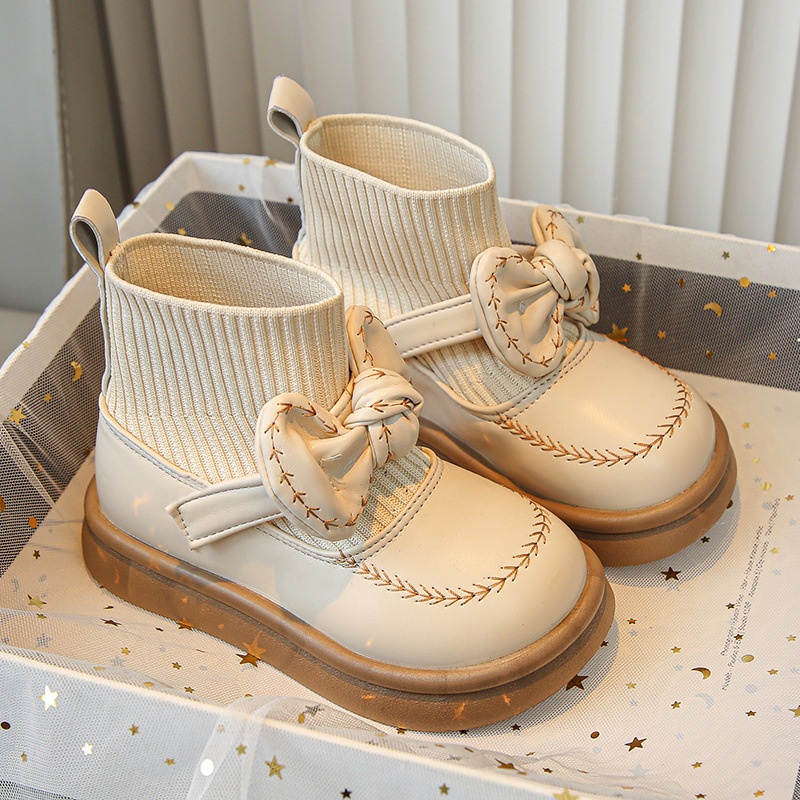 Girls'Small Leather Shoes Autumn And Winter Style Children's Fashionable And Versatile Soft-soled Socks Boots Students Casual Bow Boots