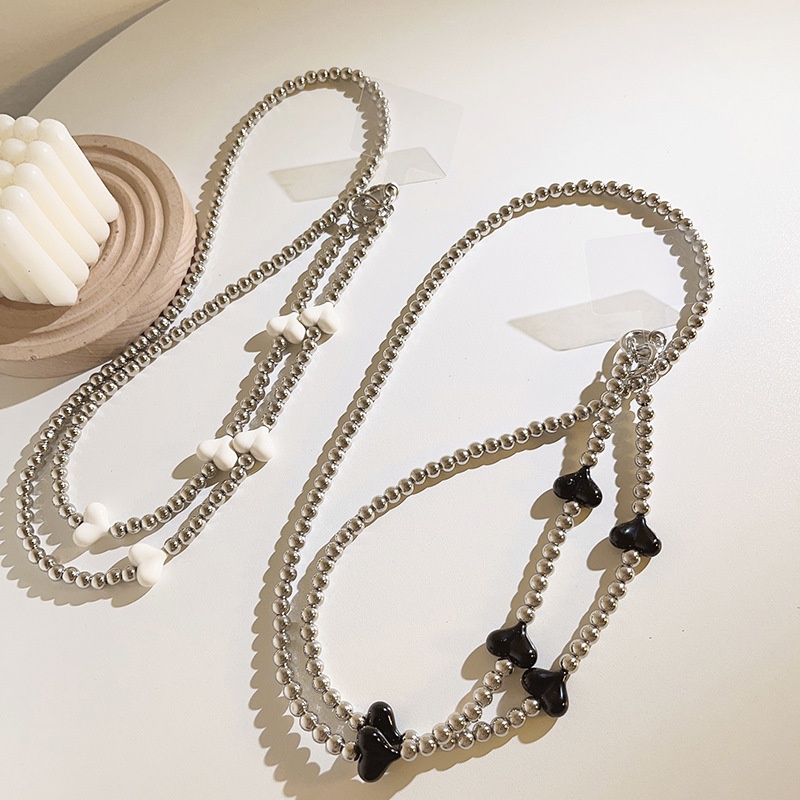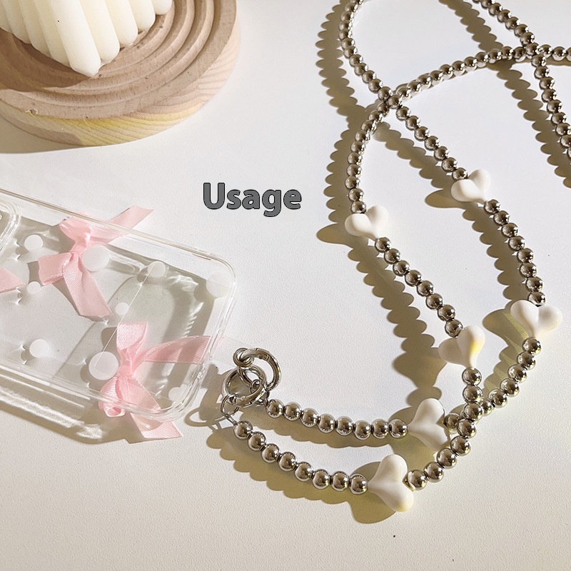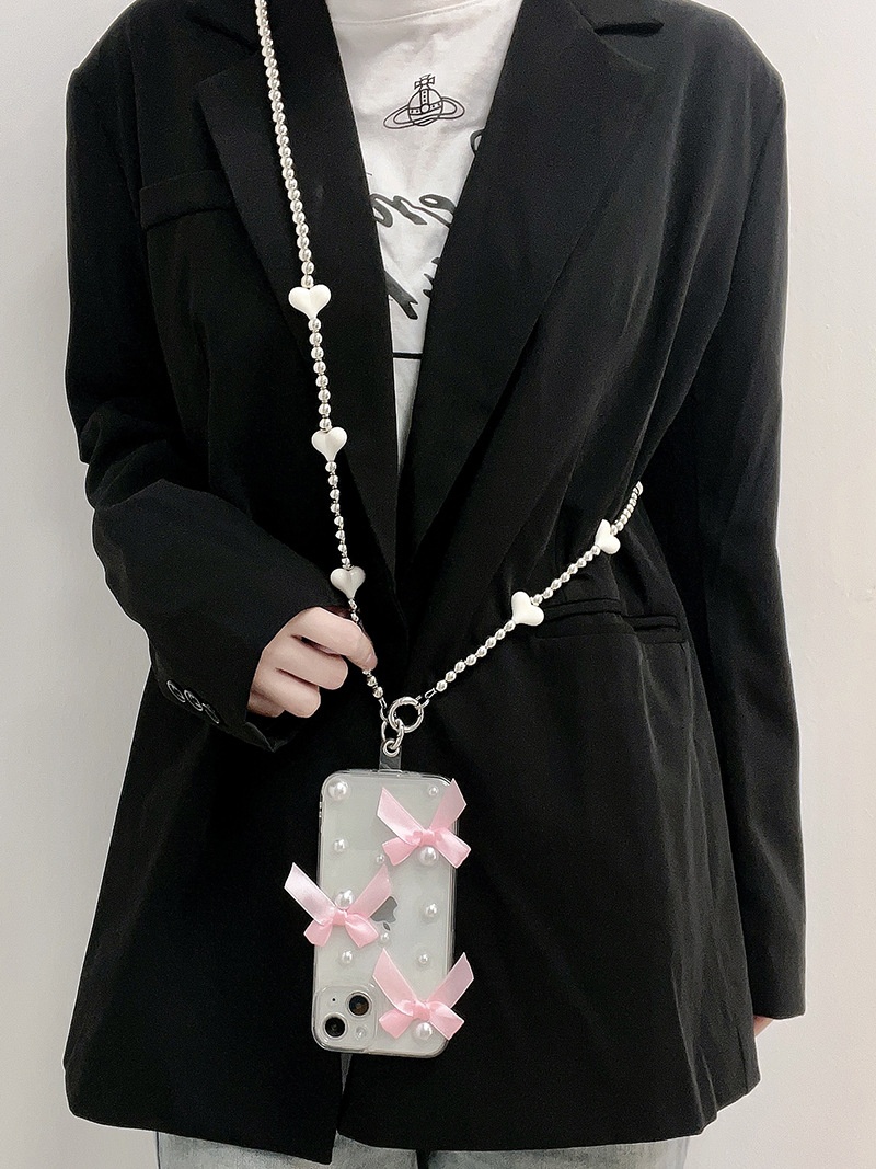 Simple Black And White Love Bow Silver Beads Diagonal Long Chain Hand Chain Universal Mobile Phone Case Mobile Phone Lanyard For Women