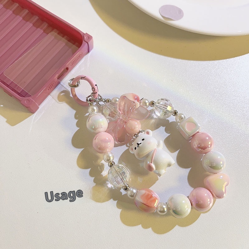 Cartoon Bear Pink Love Bead Chain Mobile Phone Chain Lanyard Short Pendant Key Chain Pendant Anti-fall For Women