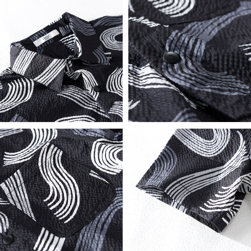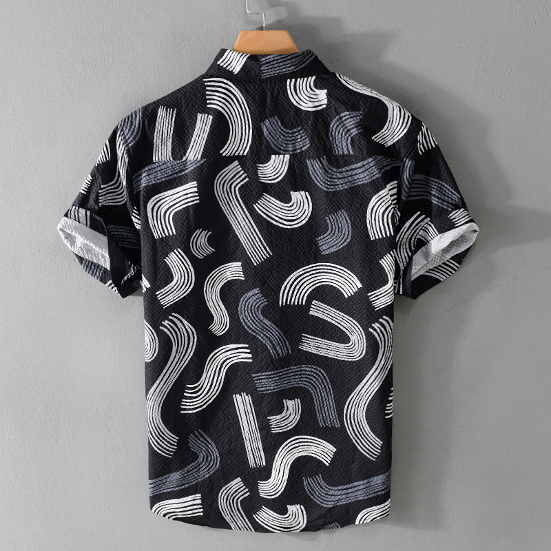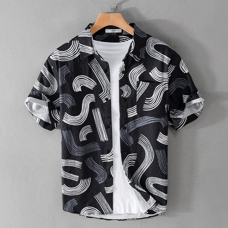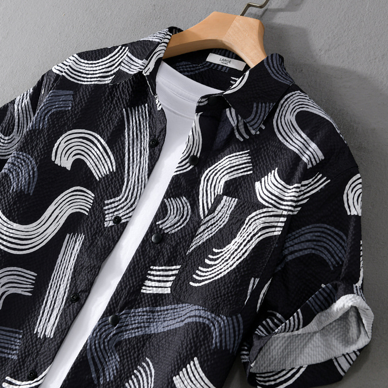 Summer Men's Color Matching Printed Short-sleeved Shirt Bubble Texture Comfortable All-match Geometric Pattern Men's Tops946