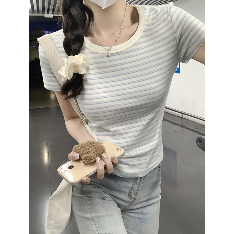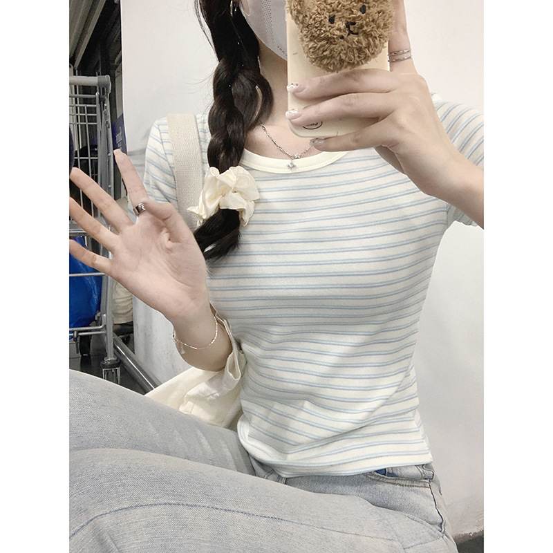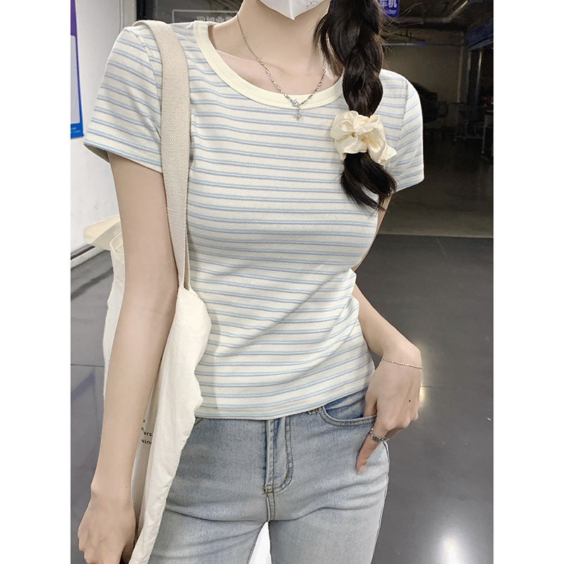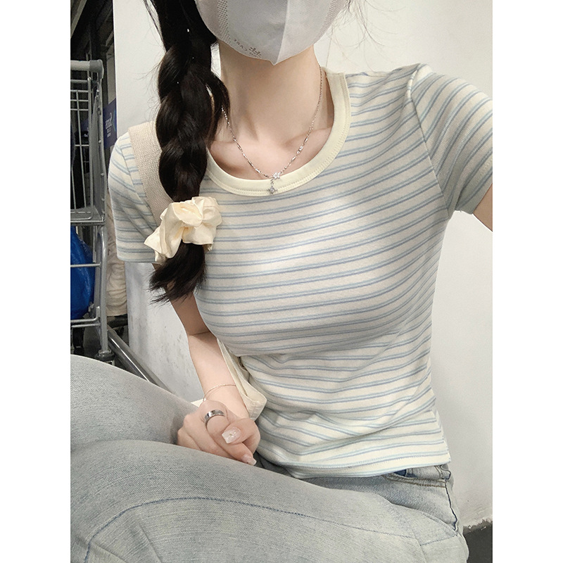 Small Fresh Milk Blue Striped Right Shoulder Short-sleeved T-shirt For Women Summer Pure Cotton Korean Style Slim Short Sweet Hot Girl Top