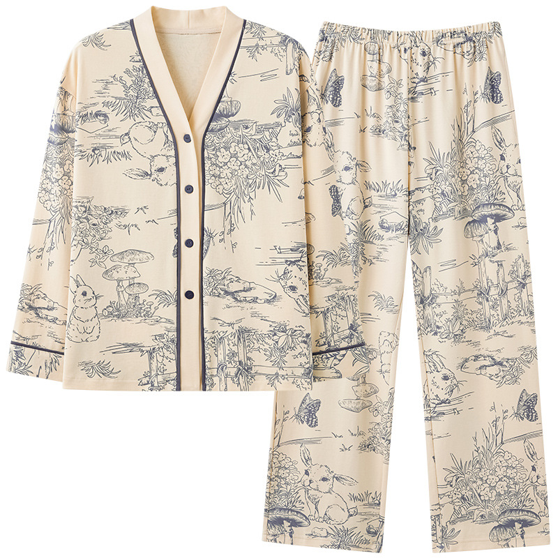 Pajamas For Women Spring And Autumn Pure Cotton Long-sleeved Cardigan Thin Cotton National Style Small Fragrance Style Kimono Can Be Worn Outside Home Clothes Set