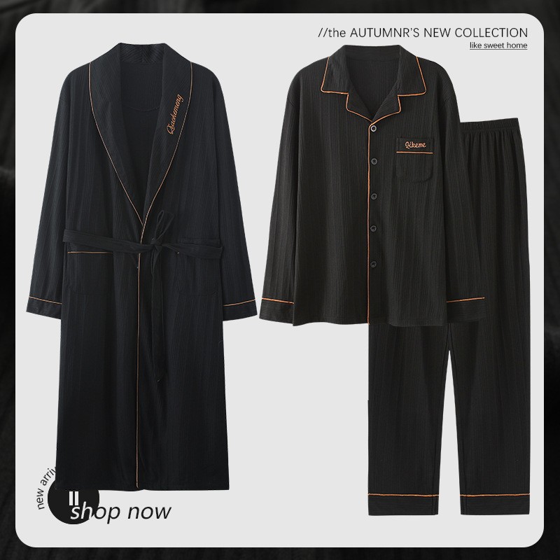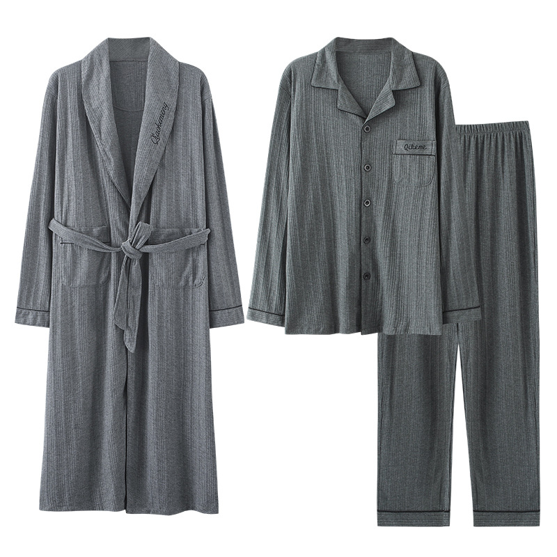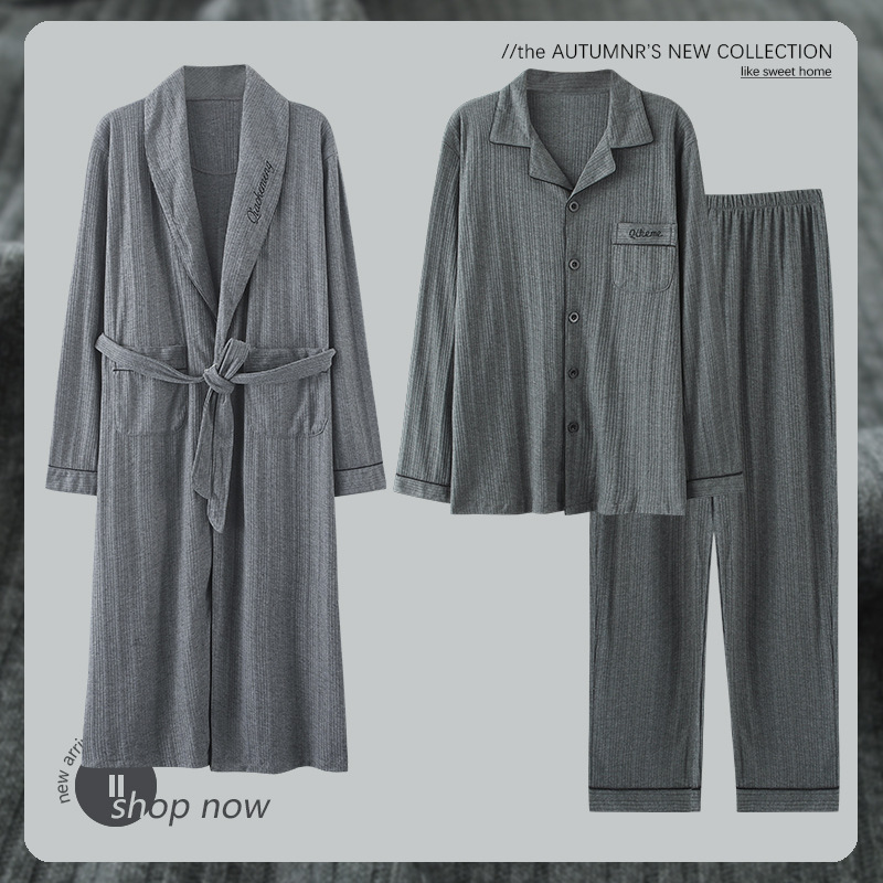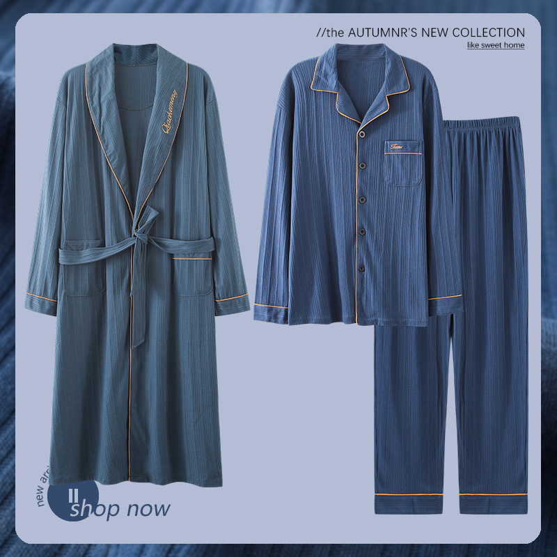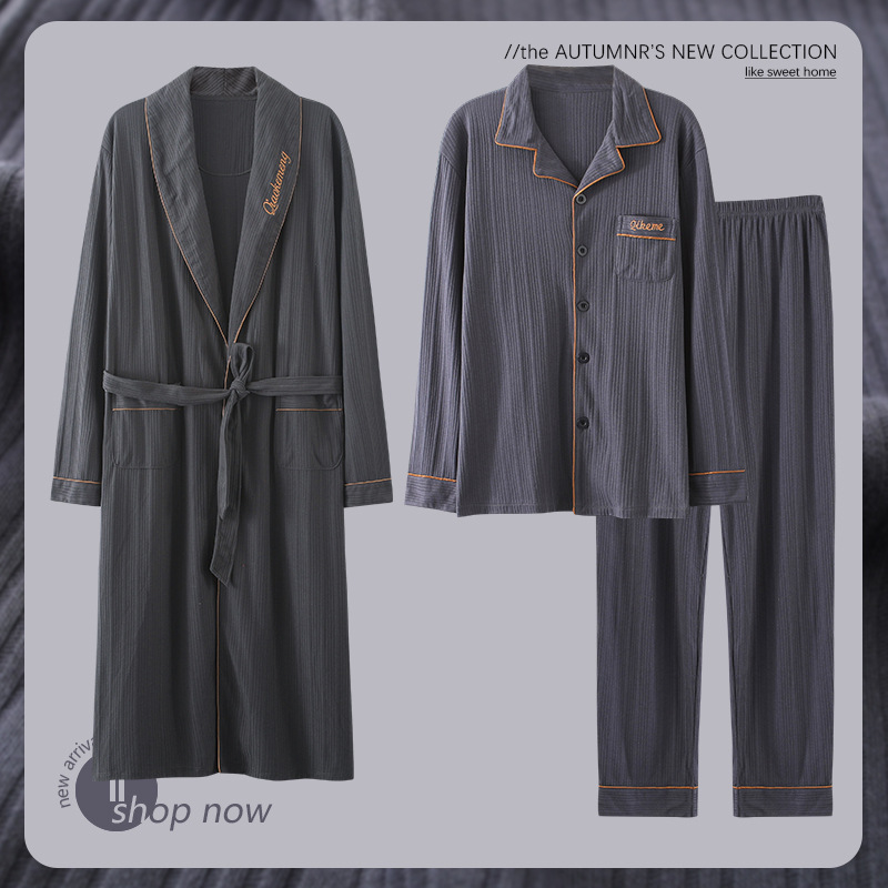 Pajamas Men's Spring And Autumn Pure Cotton Long-sleeved Long High-end Large Size Bathrobe Men's Pajamas Home Wear Three-piece Suit